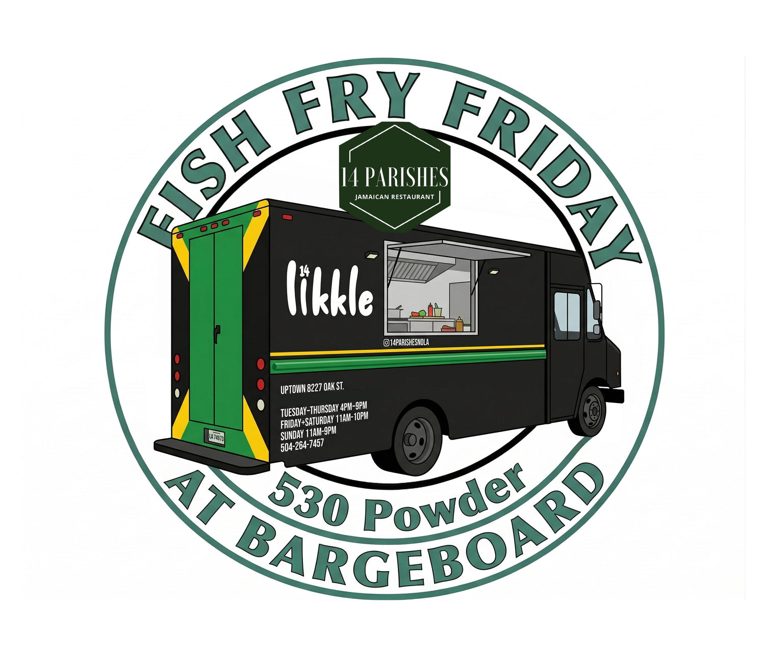 You guys absolutely cleared them out last Friday, so we’re making it official: The 14 Parishes Likkle truck is dropping anchor at Bargeboard every Friday through the end of Lent!
