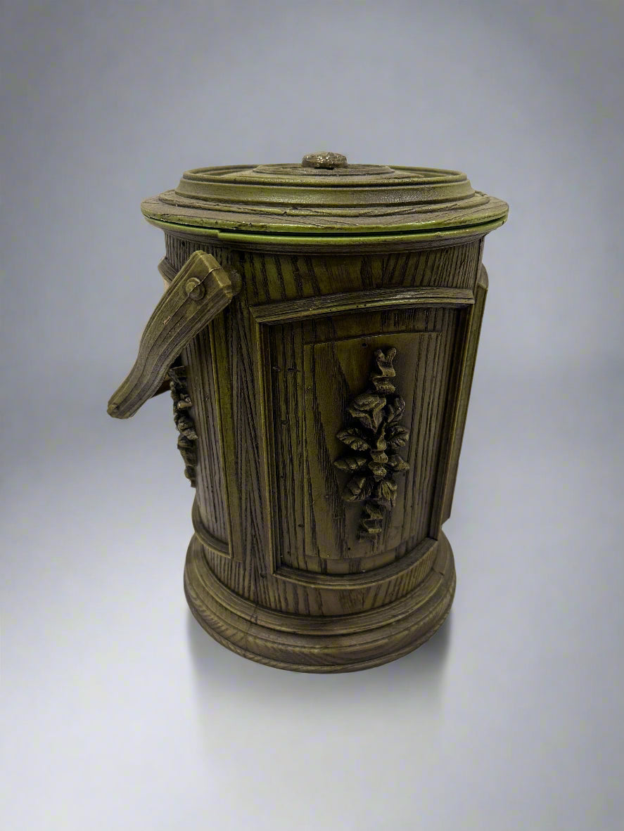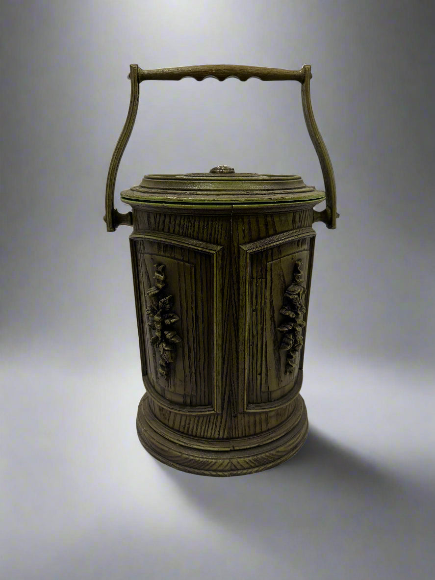 This vintage 1960's ice bucket is an avocado shade of green with rose patterns on the side. It is 10.6 inches tall and 9.2 inches wide.