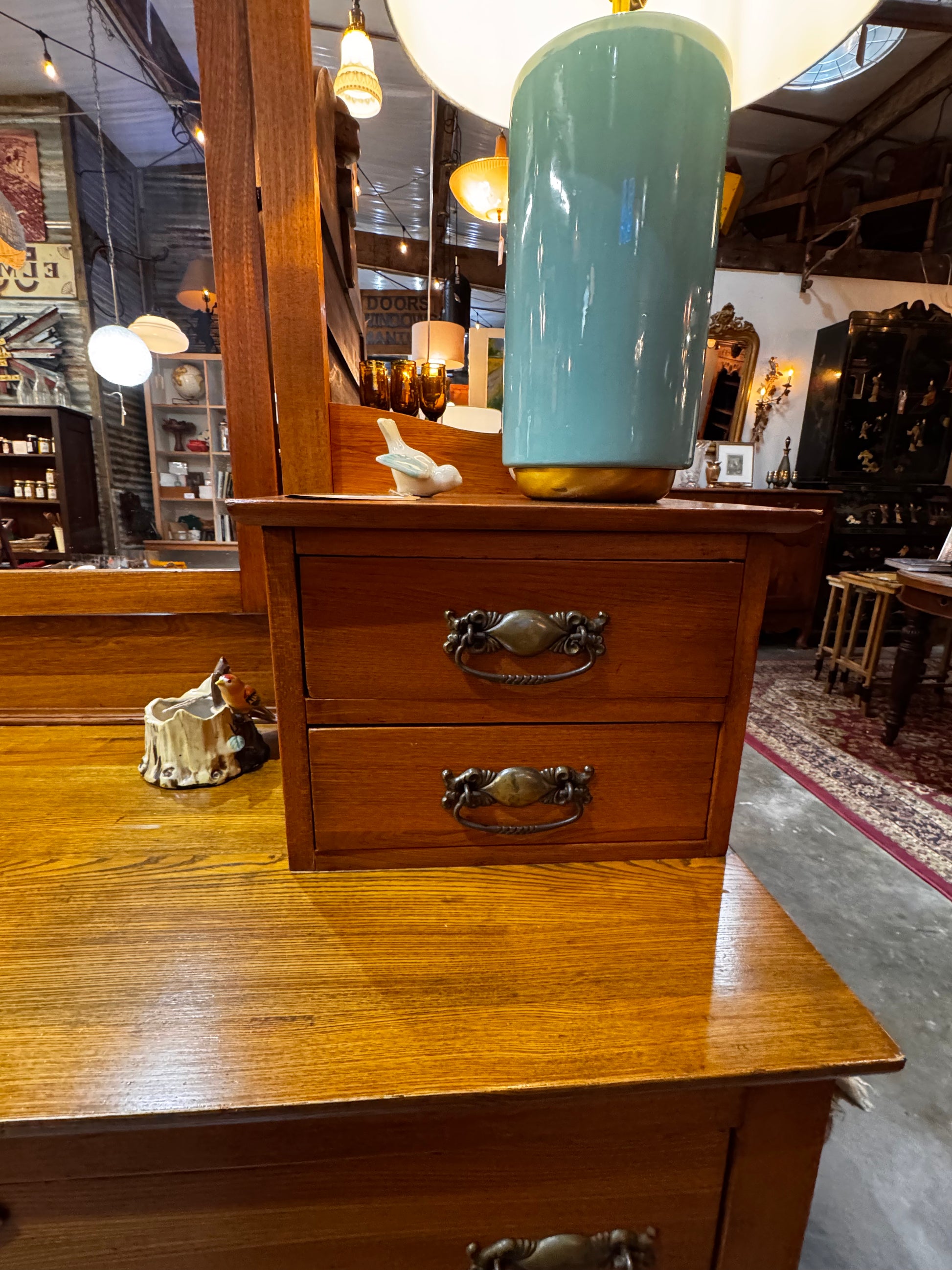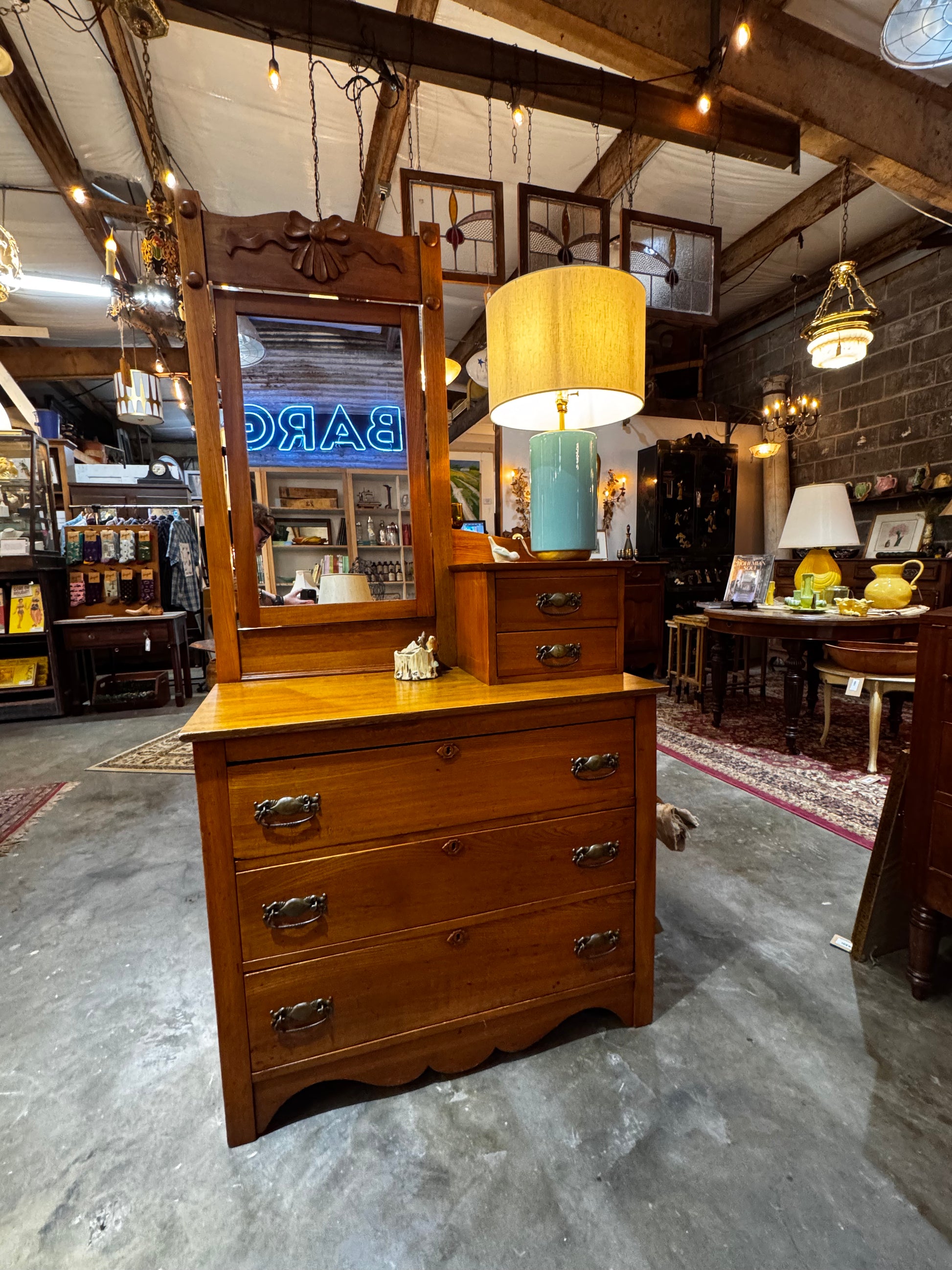 Eastlake furniture often features flat surfaces, low-relief carvings, and geometric motifs. The hardware, such as the drawer pulls, are also characteristic of the style. The mirror is a common feature of dressers from this period, adding to their functionality and aesthetic appeal. The wood appears to be oak, which was a popular choice for Eastlake furniture due to its durability and attractive grain.