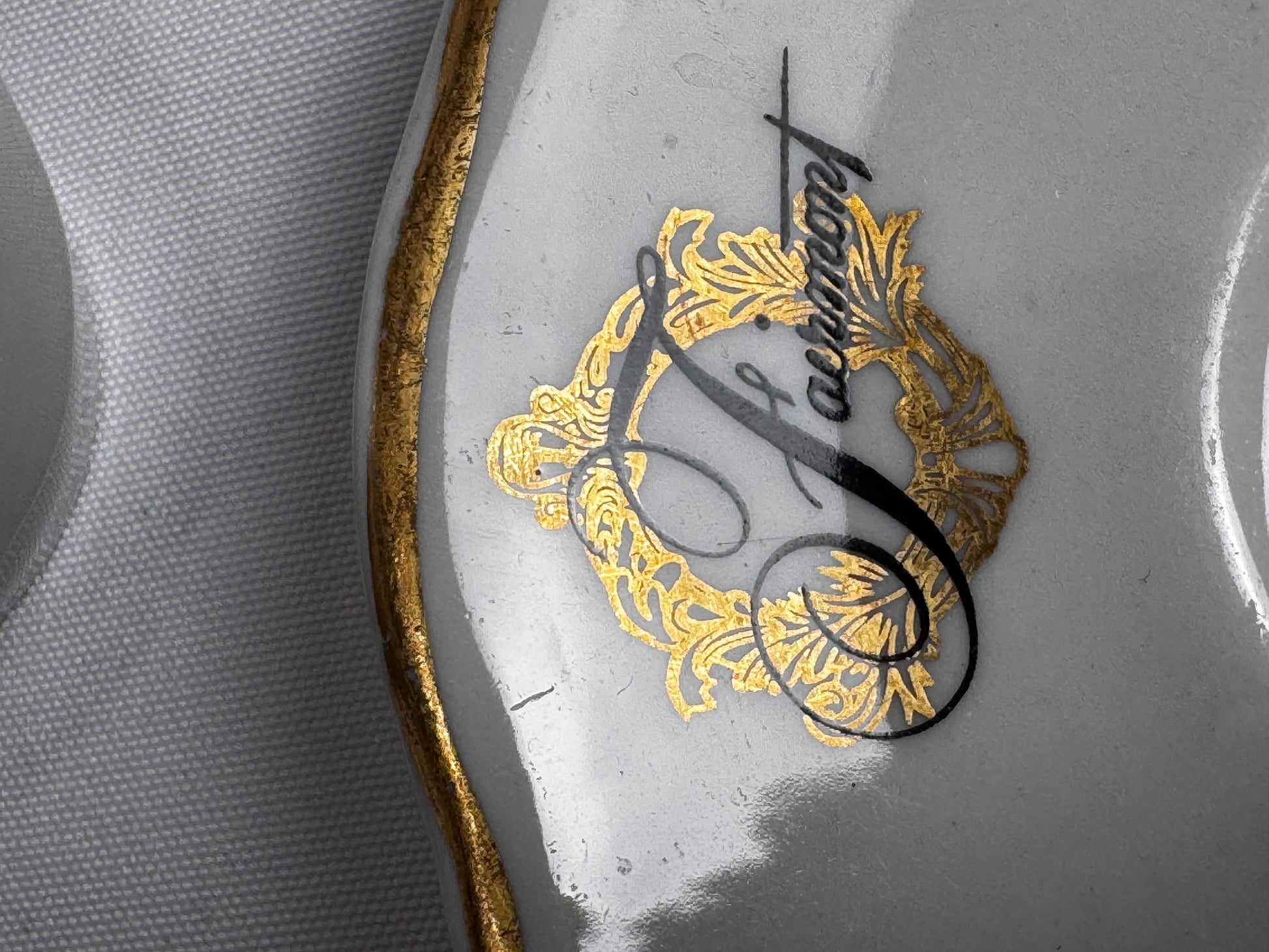 A pair of vintage white porcelain demitasse cups and saucer sets with elegant gold trim, these pieces are authentic restaurantware from the historic Fairmont Hotel in New Orleans, formerly known as The Roosevelt.
