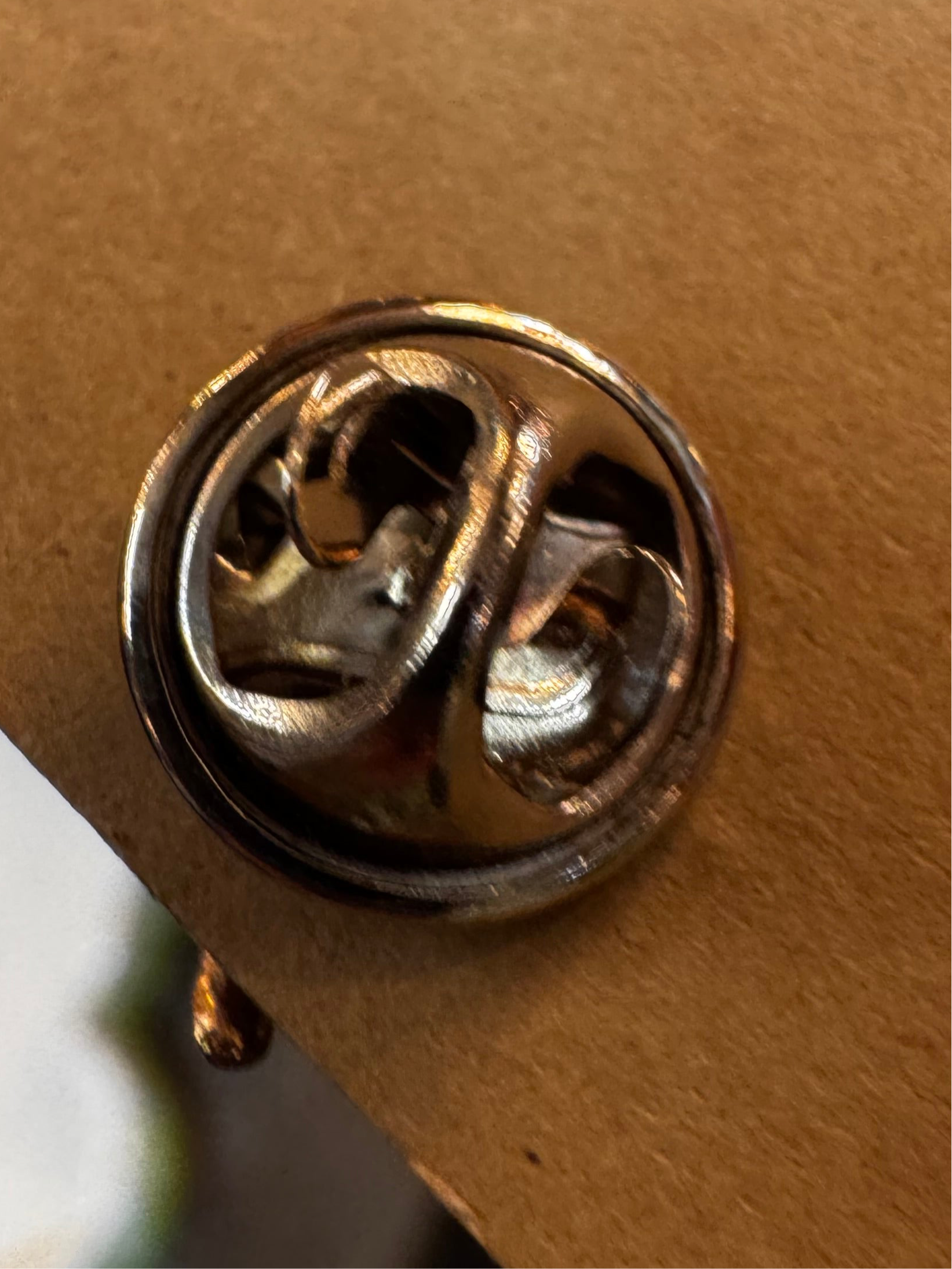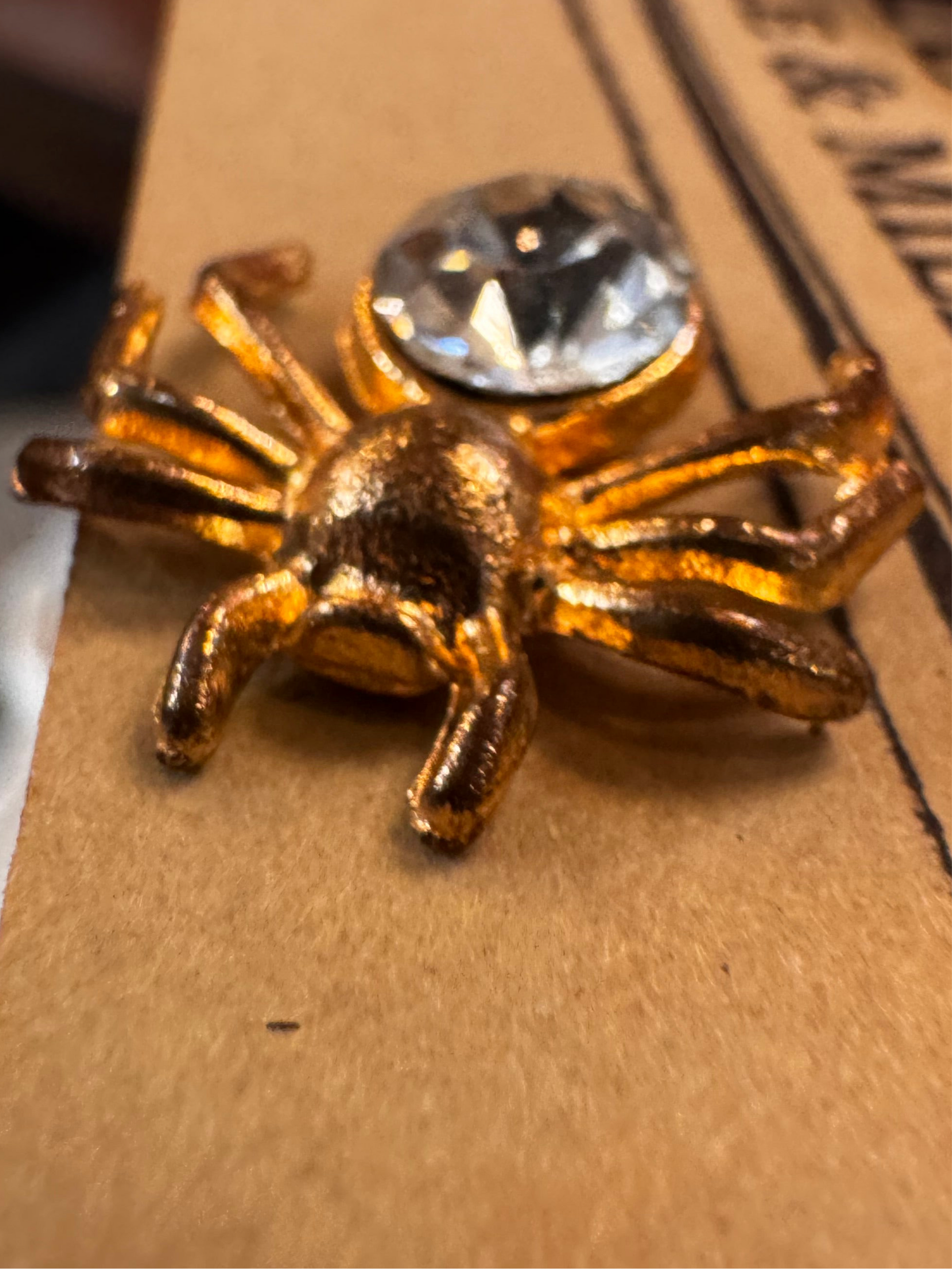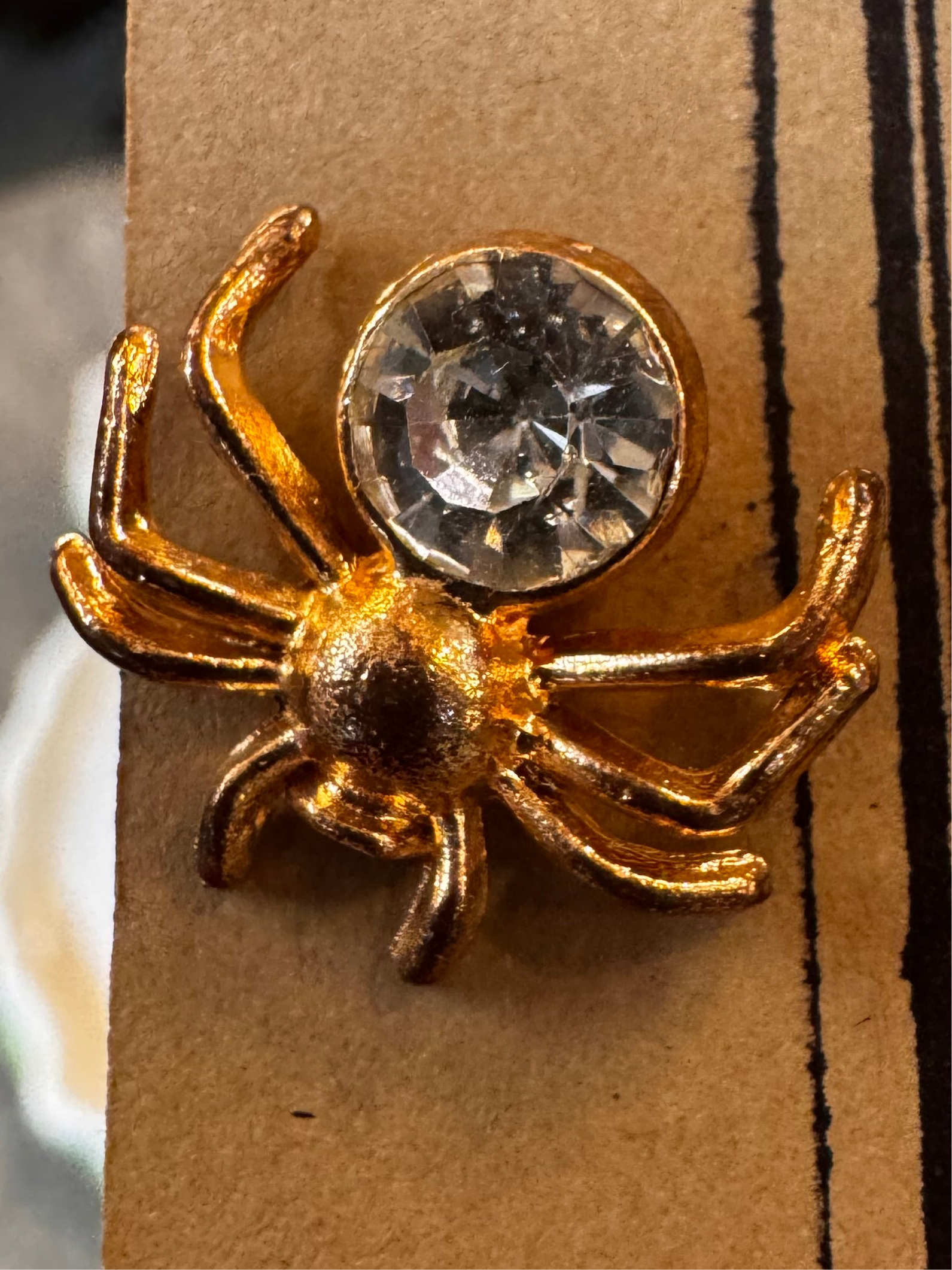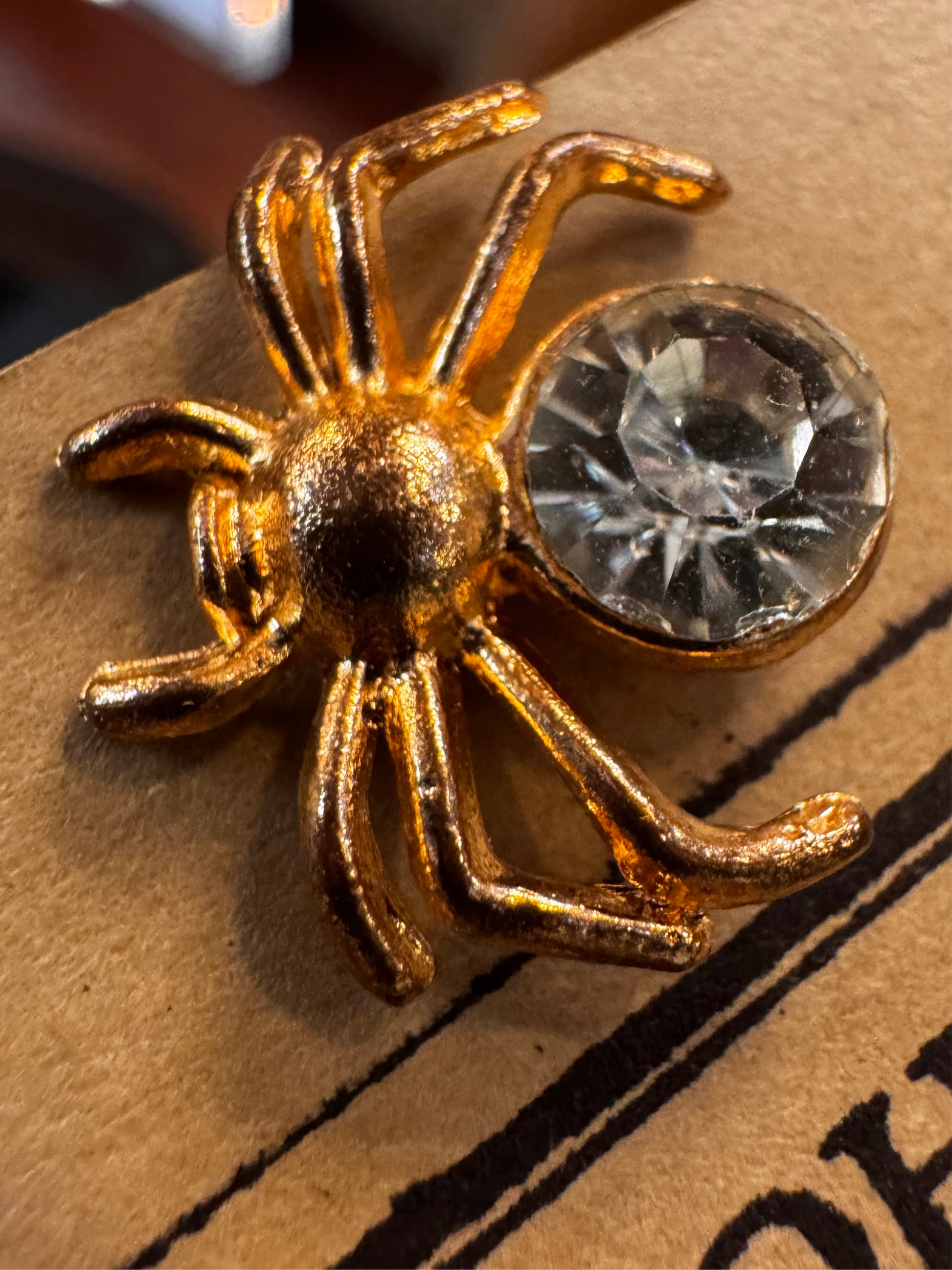 This is a small, golden-toned costume jewelry spider pin with a clear, faceted rhinestone on its back.