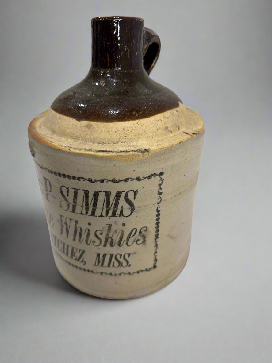 Uncover a piece of Southern history with this stunning A.P. Simms Fine Whiskies stoneware jug from 19th century Natchez, Mississippi.