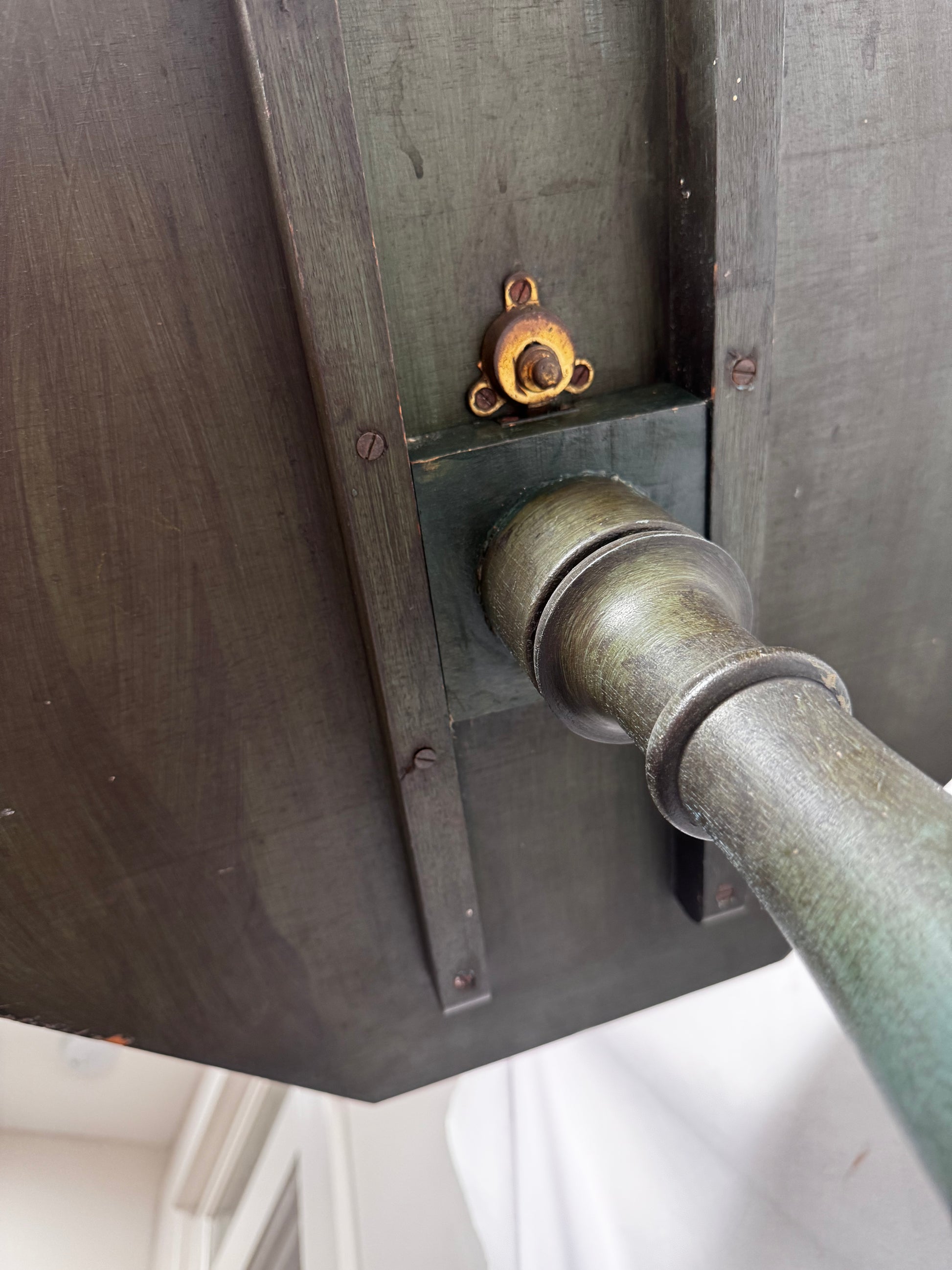This unique American Country folk art table features an octagonal wood top and a hand-painted tripod base with floral designs. Its distressed finish and age-appropriate wear give it a rich patina.
