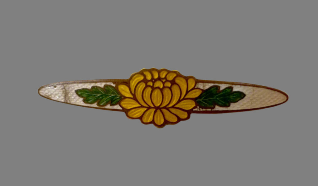 This exquisite antique brooch captures the timeless elegance of the Art Nouveau era, featuring a beautifully detailed chrysanthemum motif rendered in vibrant yellow-orange and green enamel. Crafted with the intricate cloisonné technique, and possibly incorporating delicate guilloché work on its white background, this piece showcases exceptional artistry and craftsmanship. Its organic lines and naturalistic design are hallmarks of the period's fascination with nature and Japanese aesthetics. In remarkable condition with its enamel intact and pin fully functional, this versatile brooch is a perfect statement piece for any outfit or a cherished addition to your vintage jewelry collection.