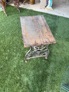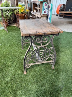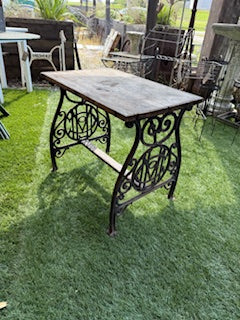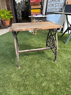 Antique cast iron and wood desk Cincinnati Metropolitan Life Co iron base with wooden top. The initials of the Cincinnati Metropolitan Life Co are on the side iron pieces. Wooden top not original. Height - 24.5 inches; Width - 27.5 inches; Depth - 18 inches.