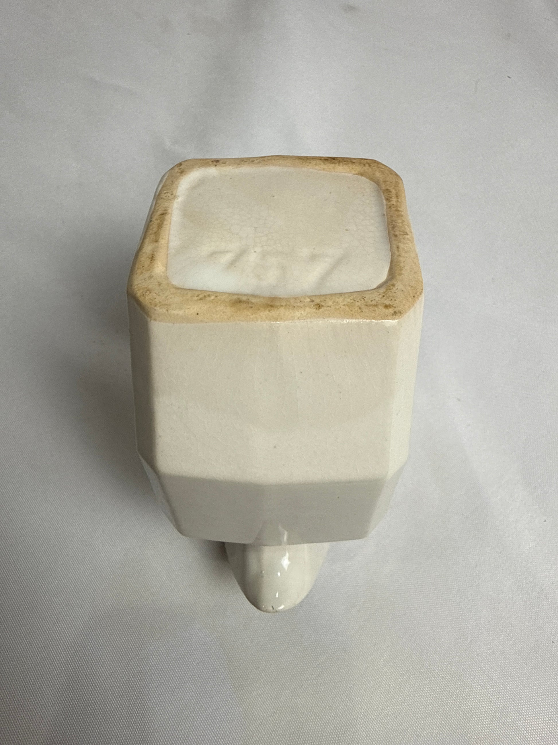 An antique white ironstone pitcher with a distinctive geometric paneled design, including octagonal relief patterns on the body and an angular handle. The piece is mold-marked “757” on the underside, indicating the pattern/shape. Likely produced in the late 19th or early 20th century by an American or English pottery manufacturer for kitchen or table use. Displays typical age-related crazing in the glaze.