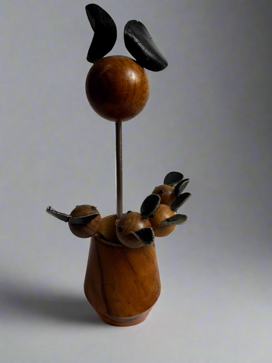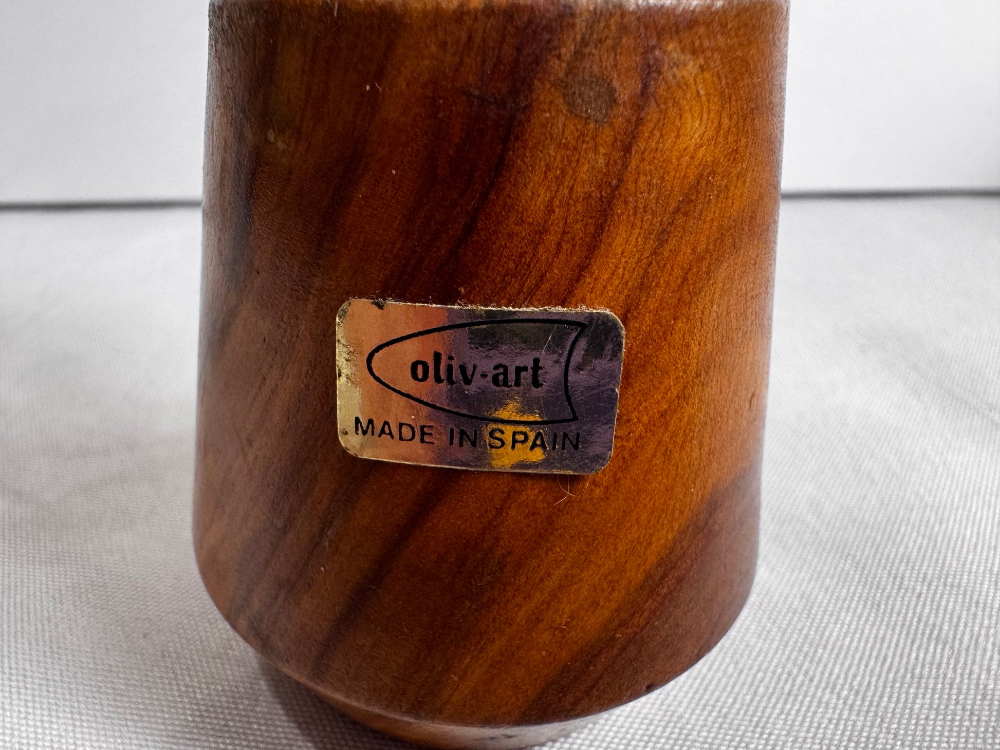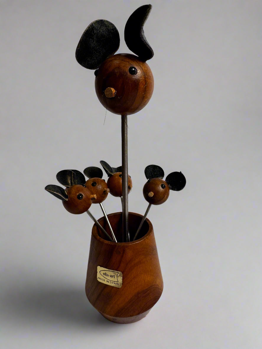 Oliv-art was a Spanish company that produced novelty wooden items, particularly during the mid-20th century. Their designs often featured whimsical characters and were popular as souvenirs and bar accessories. These items are representative of the mid-century modern design aesthetic, which emphasized playful and functional objects for the home.