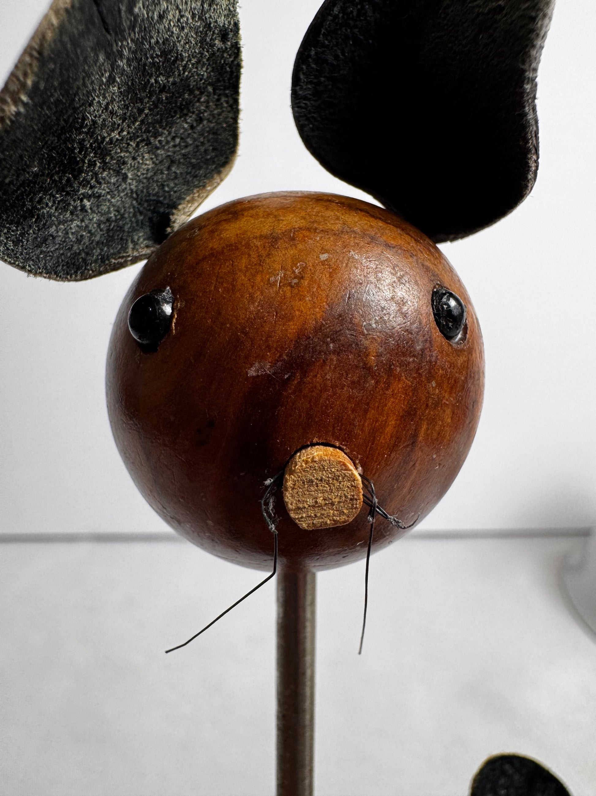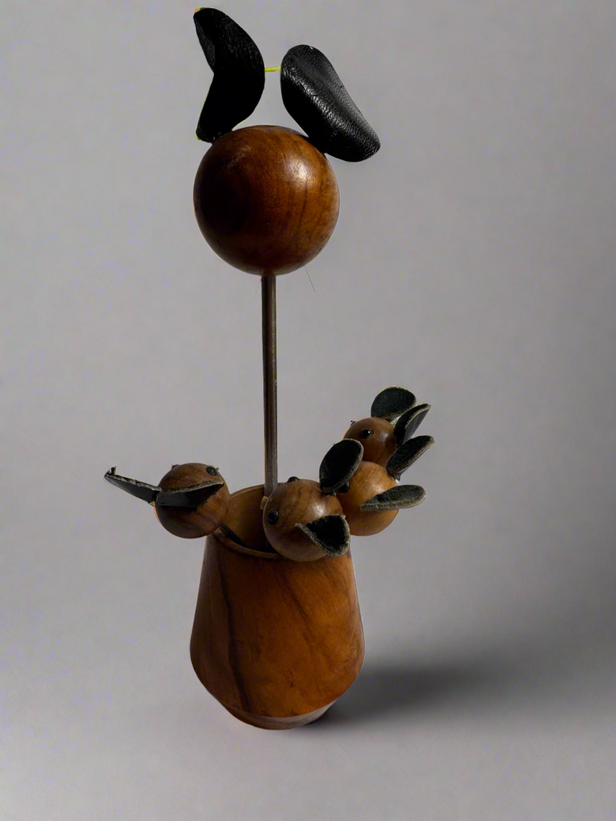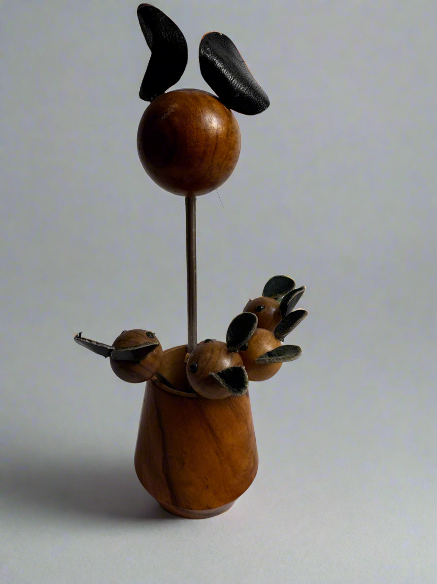 Oliv-art was a Spanish company that produced novelty wooden items, particularly during the mid-20th century. Their designs often featured whimsical characters and were popular as souvenirs and bar accessories. These items are representative of the mid-century modern design aesthetic, which emphasized playful and functional objects for the home.