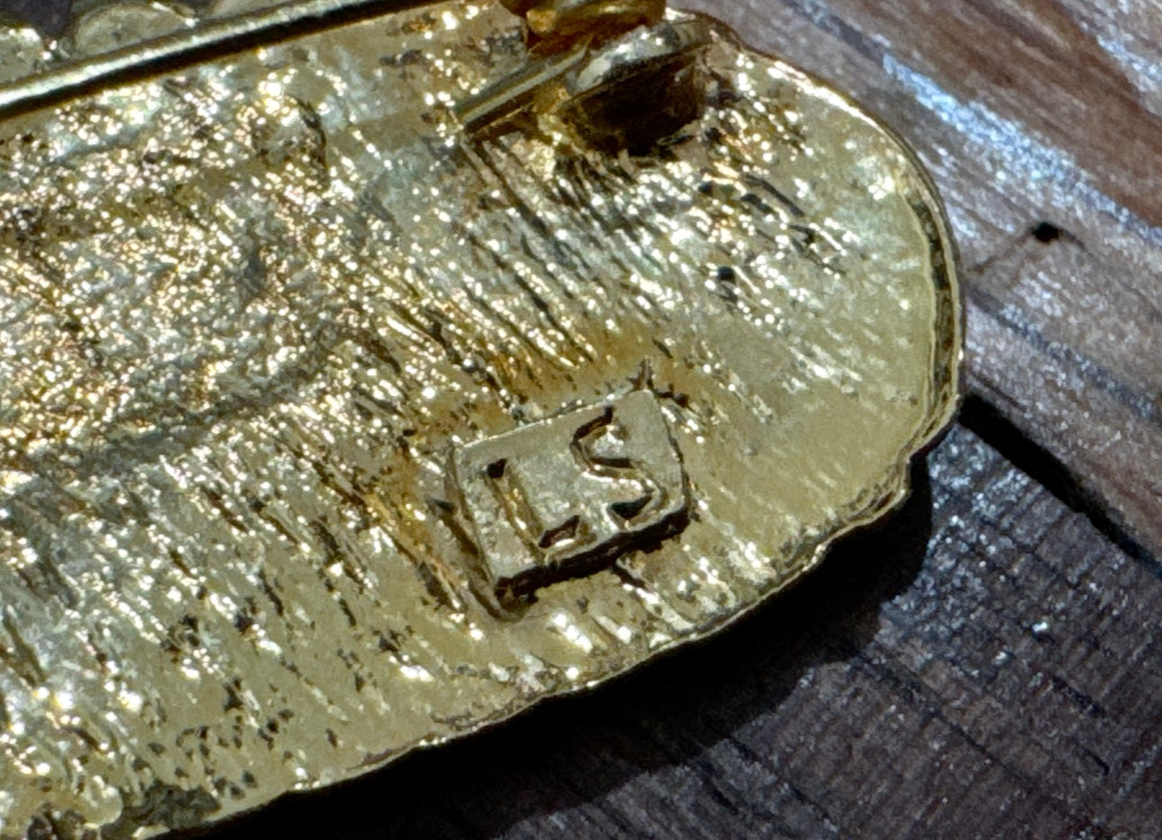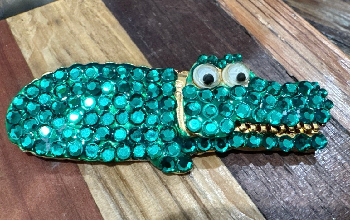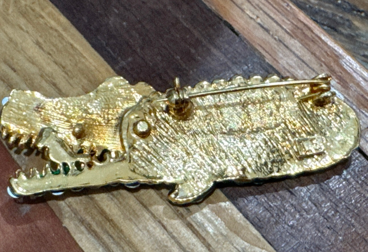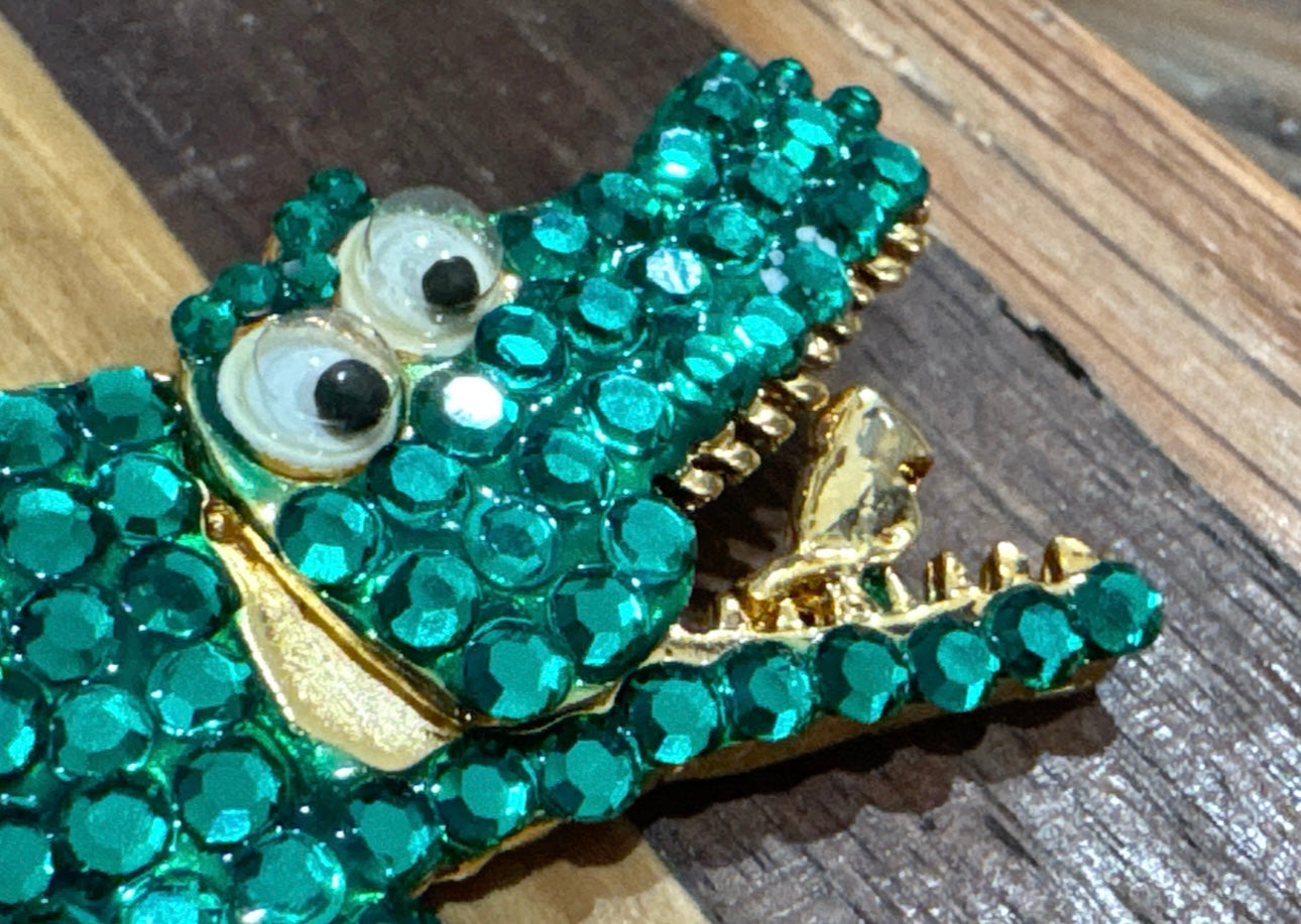 This charming and detailed vintage brooch is a remarkable piece of collectible costume jewelry. It is designed in the form of an alligator, with its body entirely covered in a dazzling array of faceted green rhinestones. The gold-toned metal has a textured finish that gives the piece a distinctive and scaly appearance.