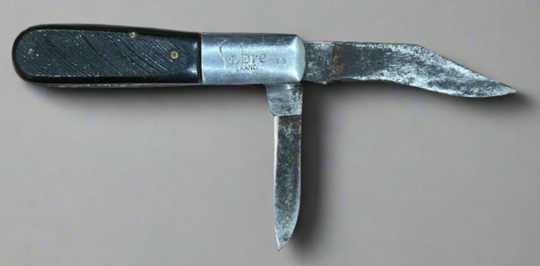This vintage Saber brand Barlow pocket knife made in Japan has two blades. It is 6 x 0.75 inches.