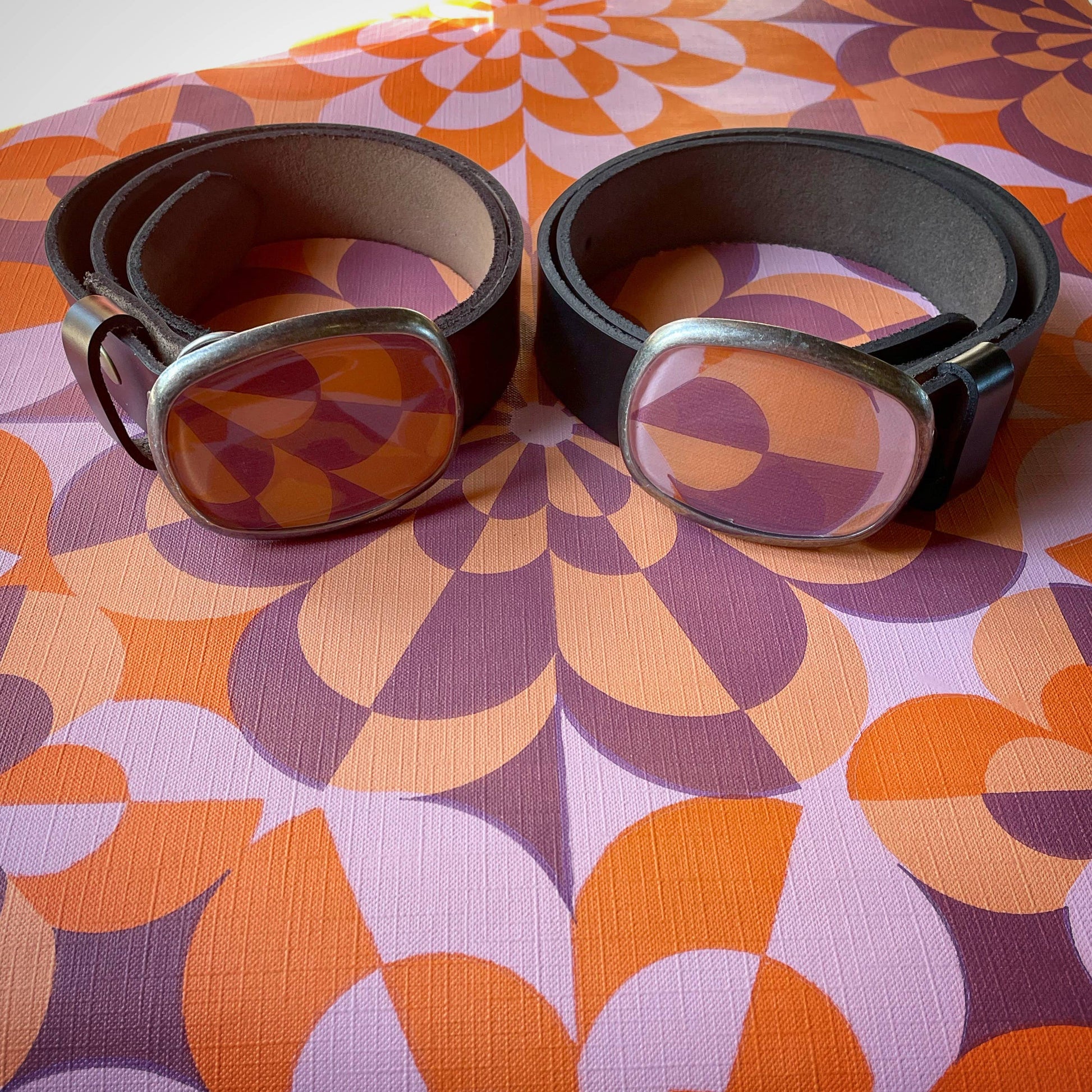 vintage mod imagery/resin, 2 1/2" x 3 1/4" antique nickel buckle. One-of-a-kind belt buckles with earthy pastel colorways and soothing psychedelic patterns. Each buckle features repurposed imagery from ORIGINAL vintage mod wallpaper from the 1970's that's been layered in protective resin. This timeless style looks great belted with jeans or over a funky tunic. As they're each made with original vintage materials and one-of-a-kind, they will be slightly different from what is pictured but will share the same aesthetic. I am happy to email photos of a collection on request.