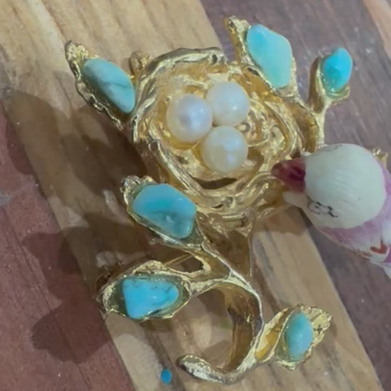 Vintage gold-tone figural brooch featuring a carved ceramic bird perched on a branch above a nest containing three faux pearl eggs and set with faux turquoise leaves