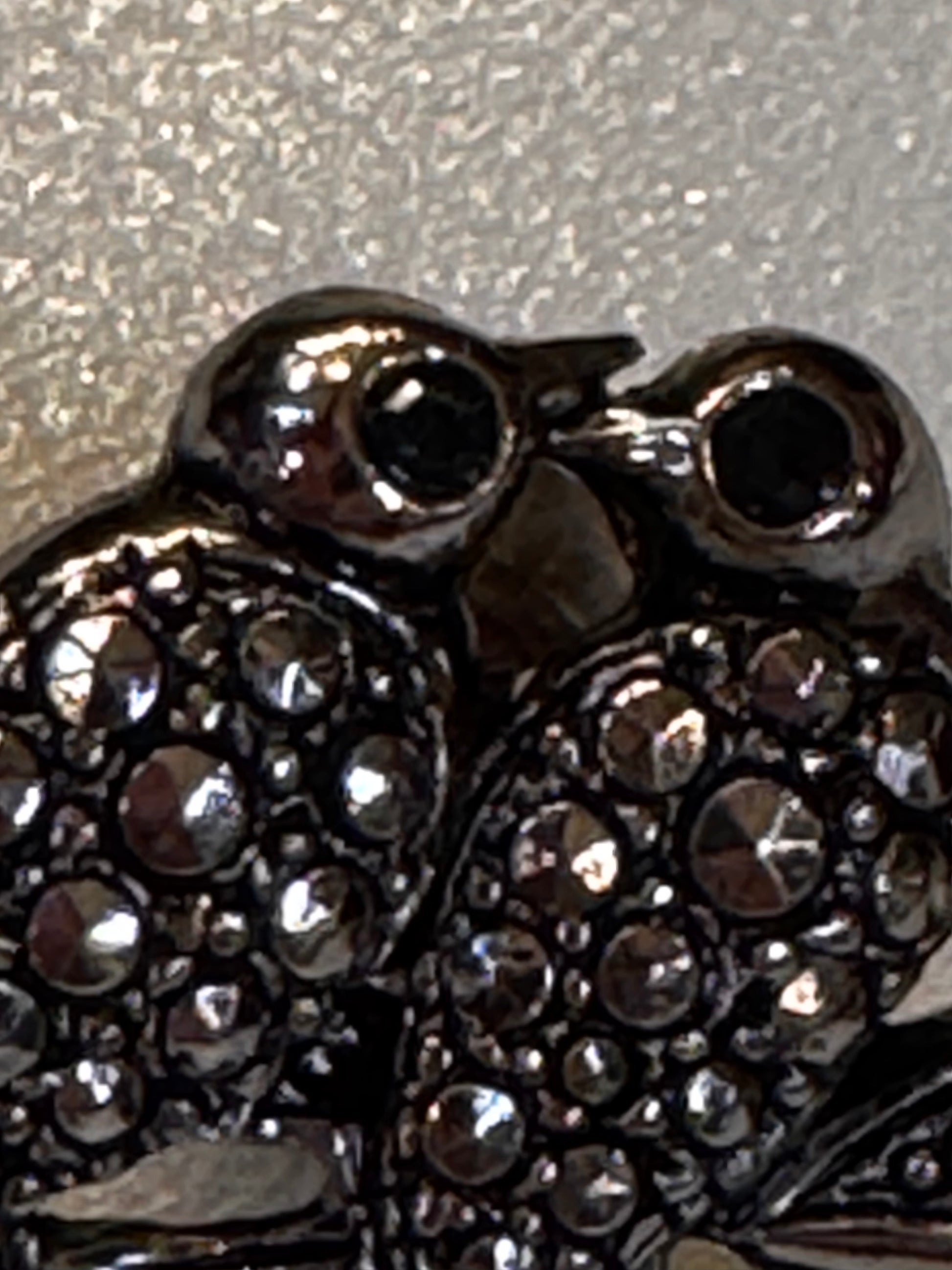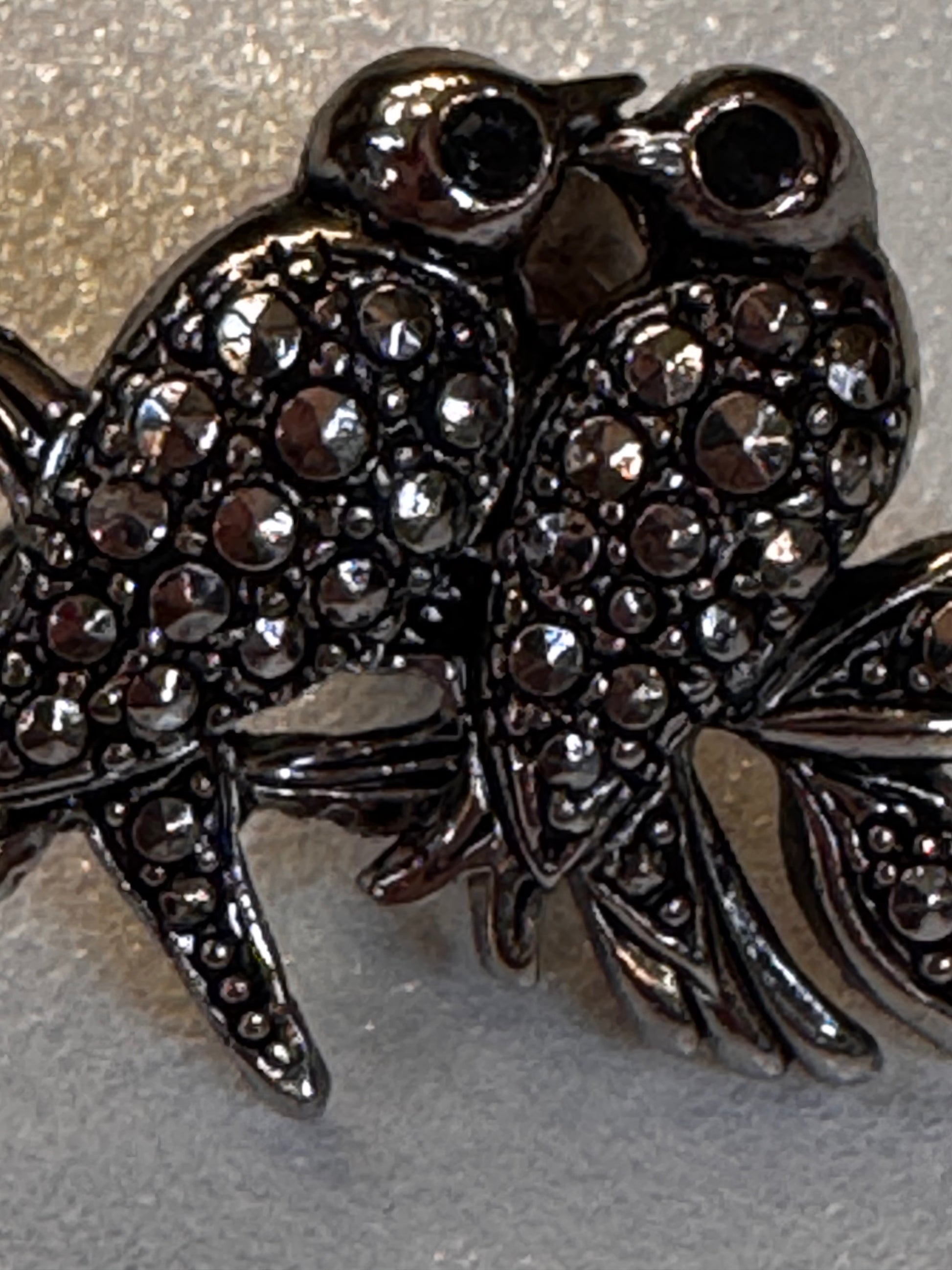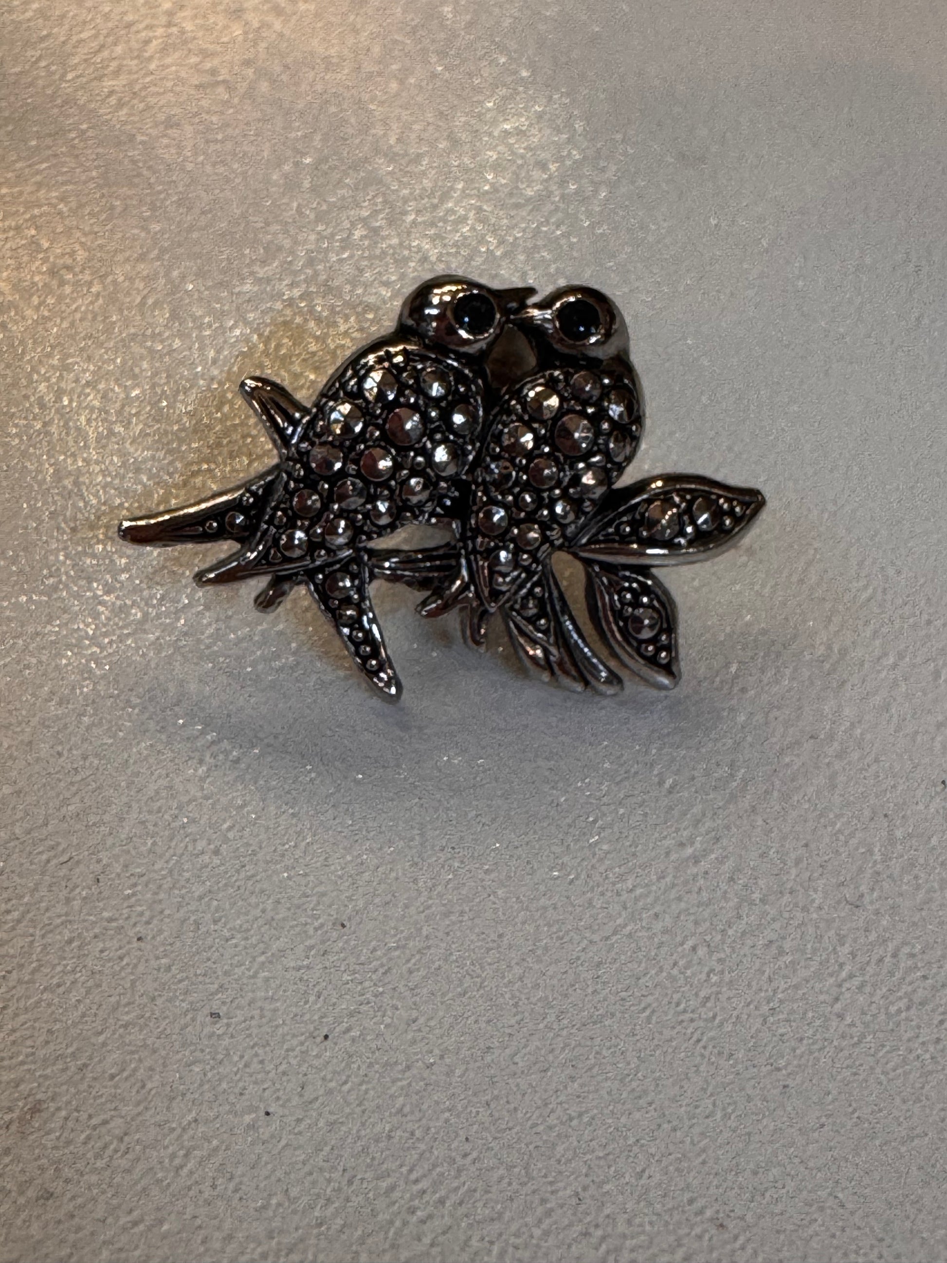 Silver-tone pin featuring two birds embellished with faceted, marcasite-style stones.