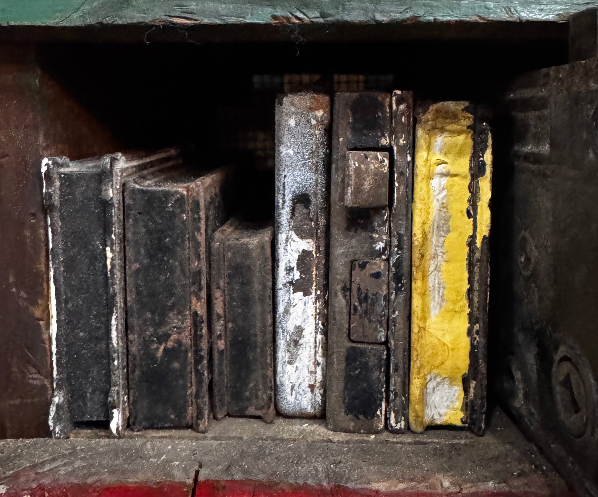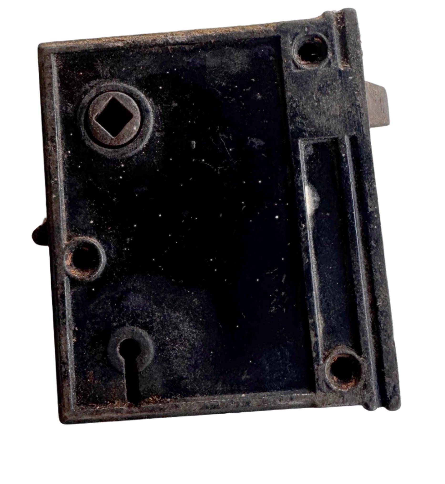 Rim lock, also known as a box lock or carpenter lock. It is an older type of lock that mounts to the surface of a door rather than being set into the edge. Rim locks typically consist of a surface-mounted box containing a deadbolt and a latch. These locks were common from the mid-1800s to the early 1900s. No key.