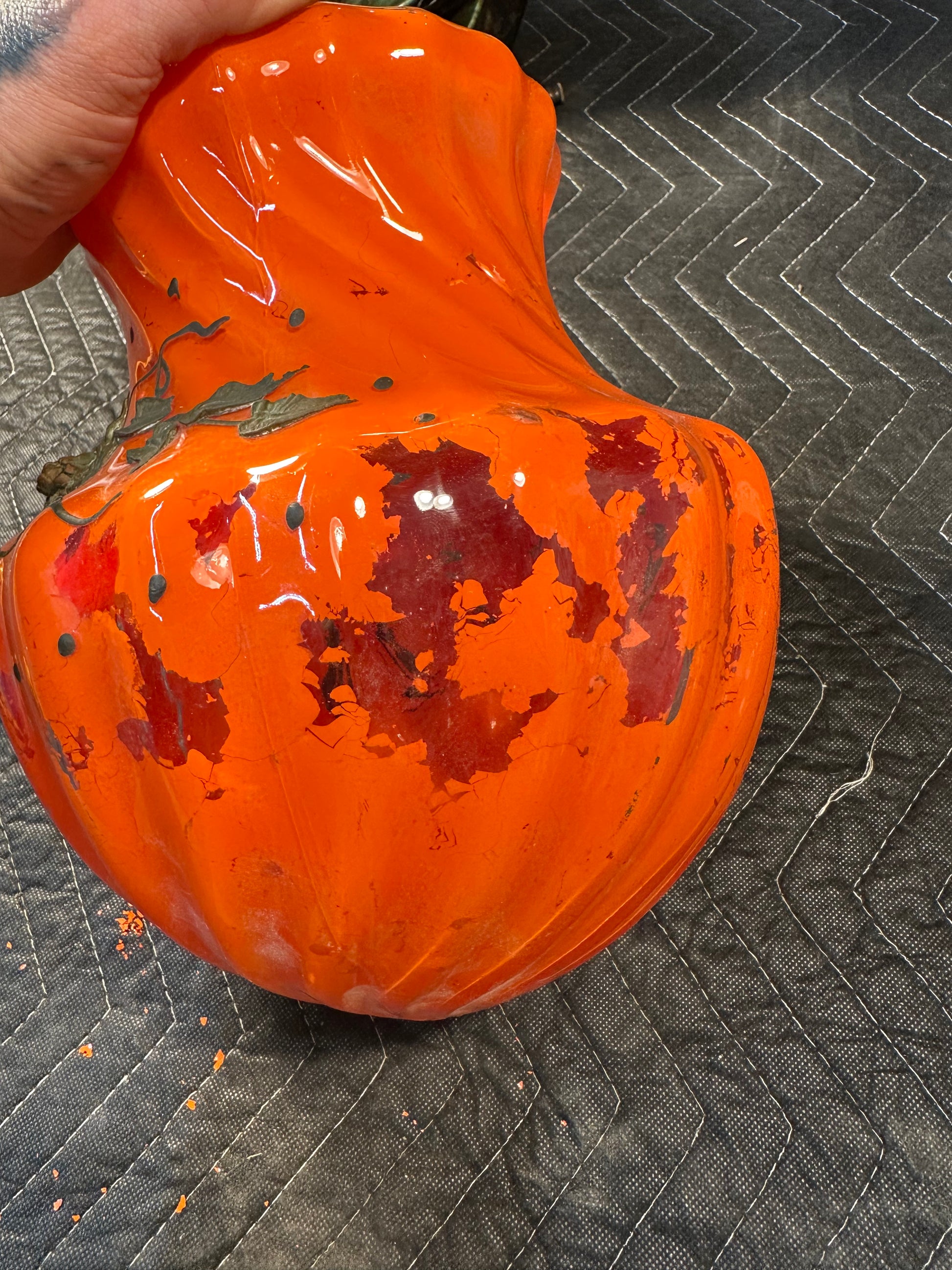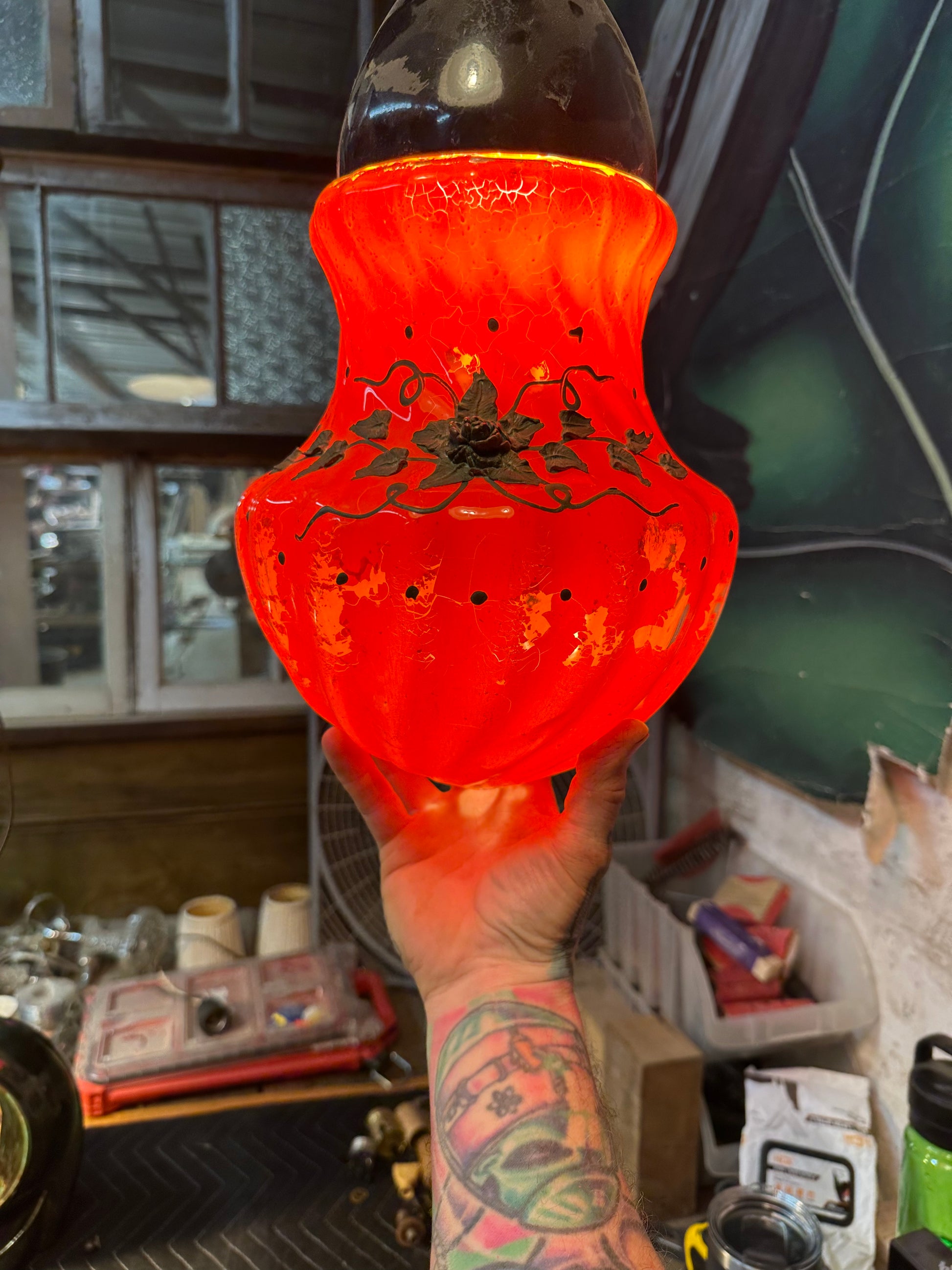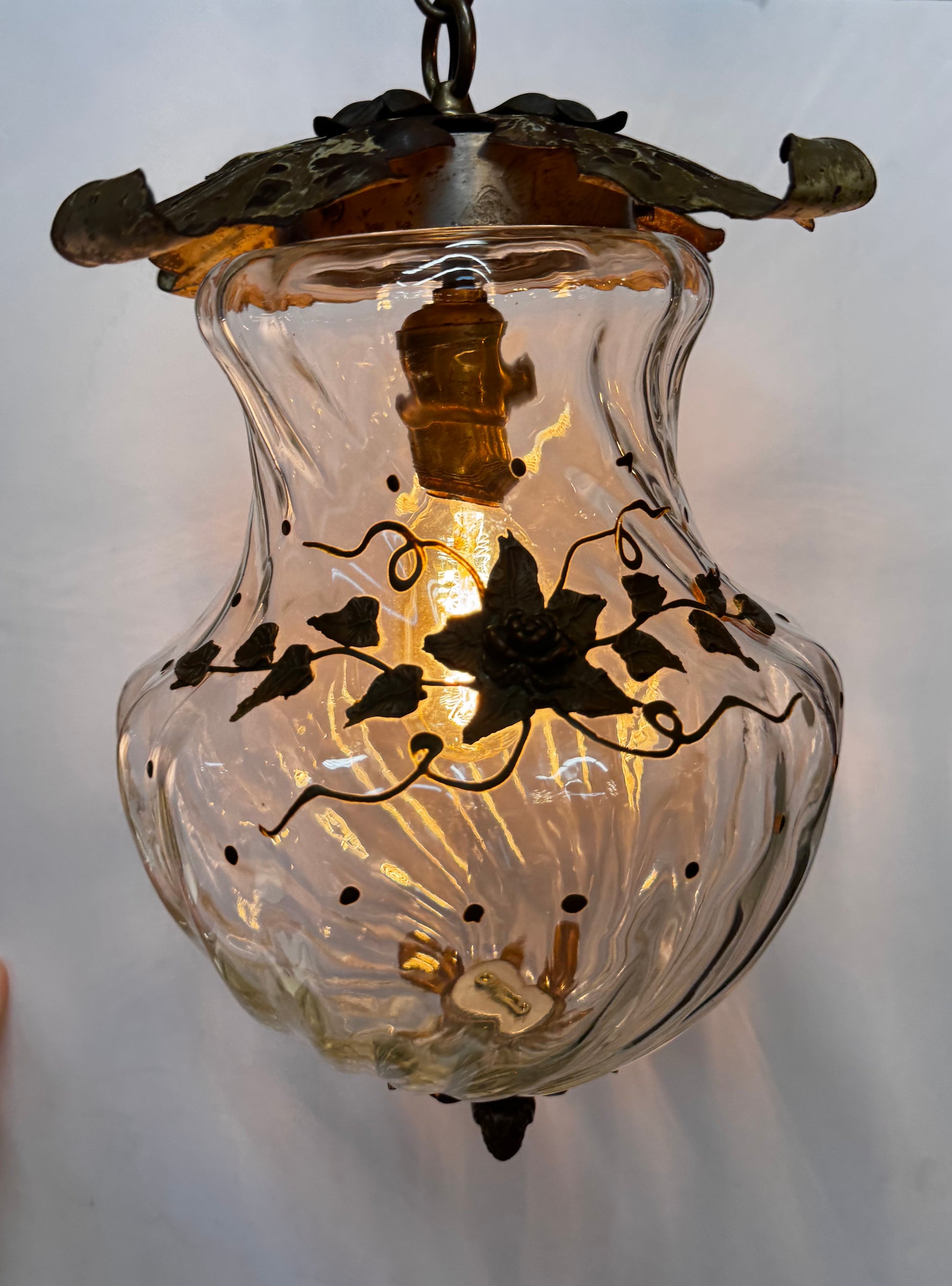 This particular pendant light, with its applied floral and vine decorations on textured glass and ornate metal accents, aligns with the aesthetic sensibilities of the Art Nouveau or Arts and Crafts periods. Such fixtures were popular in homes and public spaces, valued for their craftsmanship and the warm, inviting light they cast. The use of metal to mimic natural elements like leaves and flowers was a hallmark of these design eras, aiming to bring the beauty of nature indoors. This pendant has been stripped, rewired and redone to capture it’s original charm.