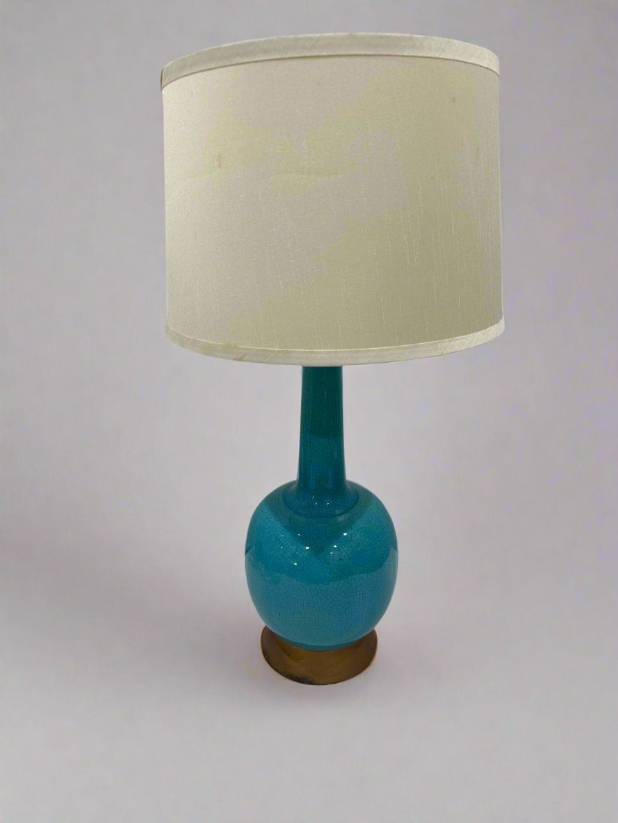 This ceramic lamp with a blue glaze is 27inches tall and 12.25 inches across with its included shade.