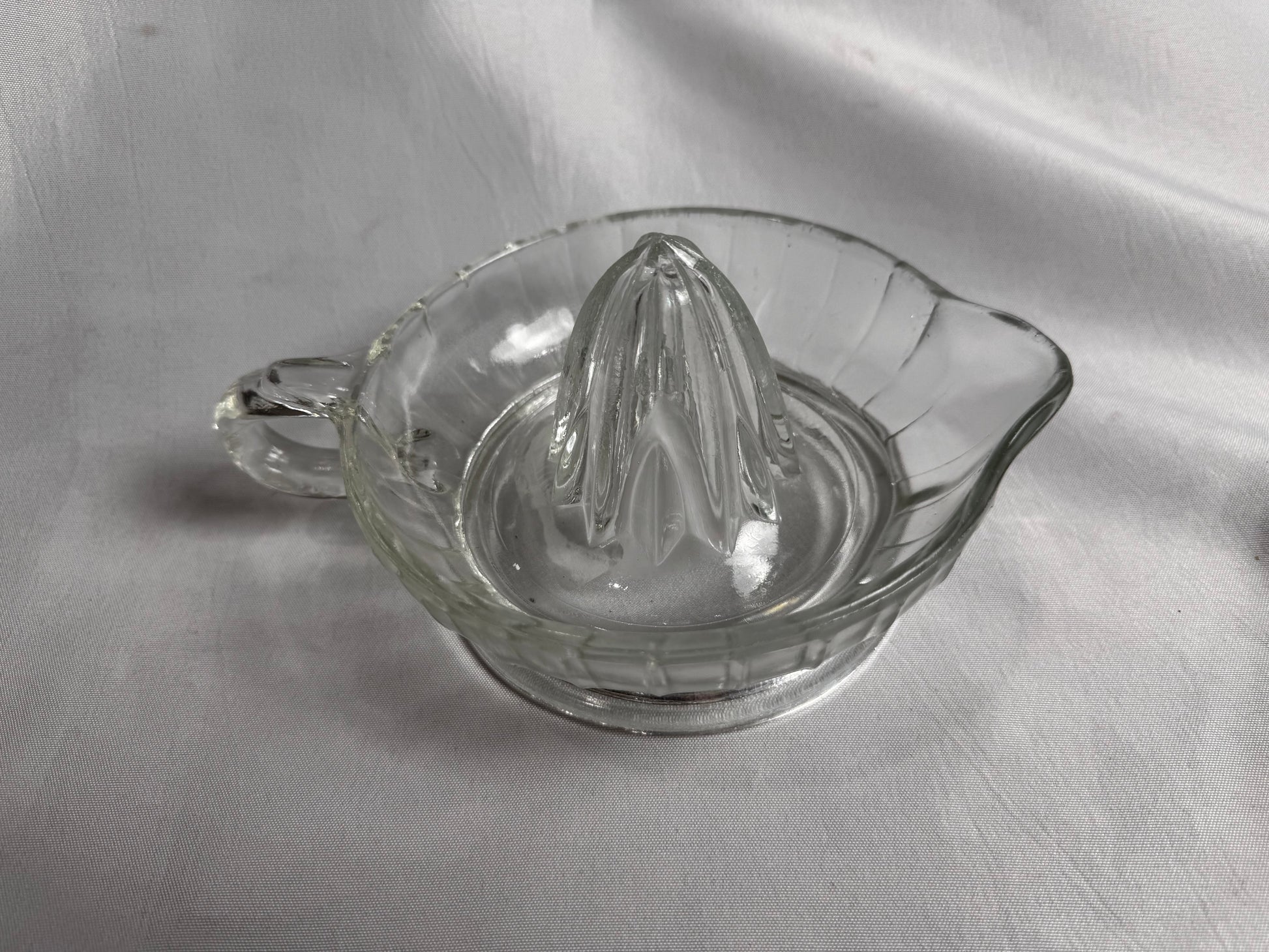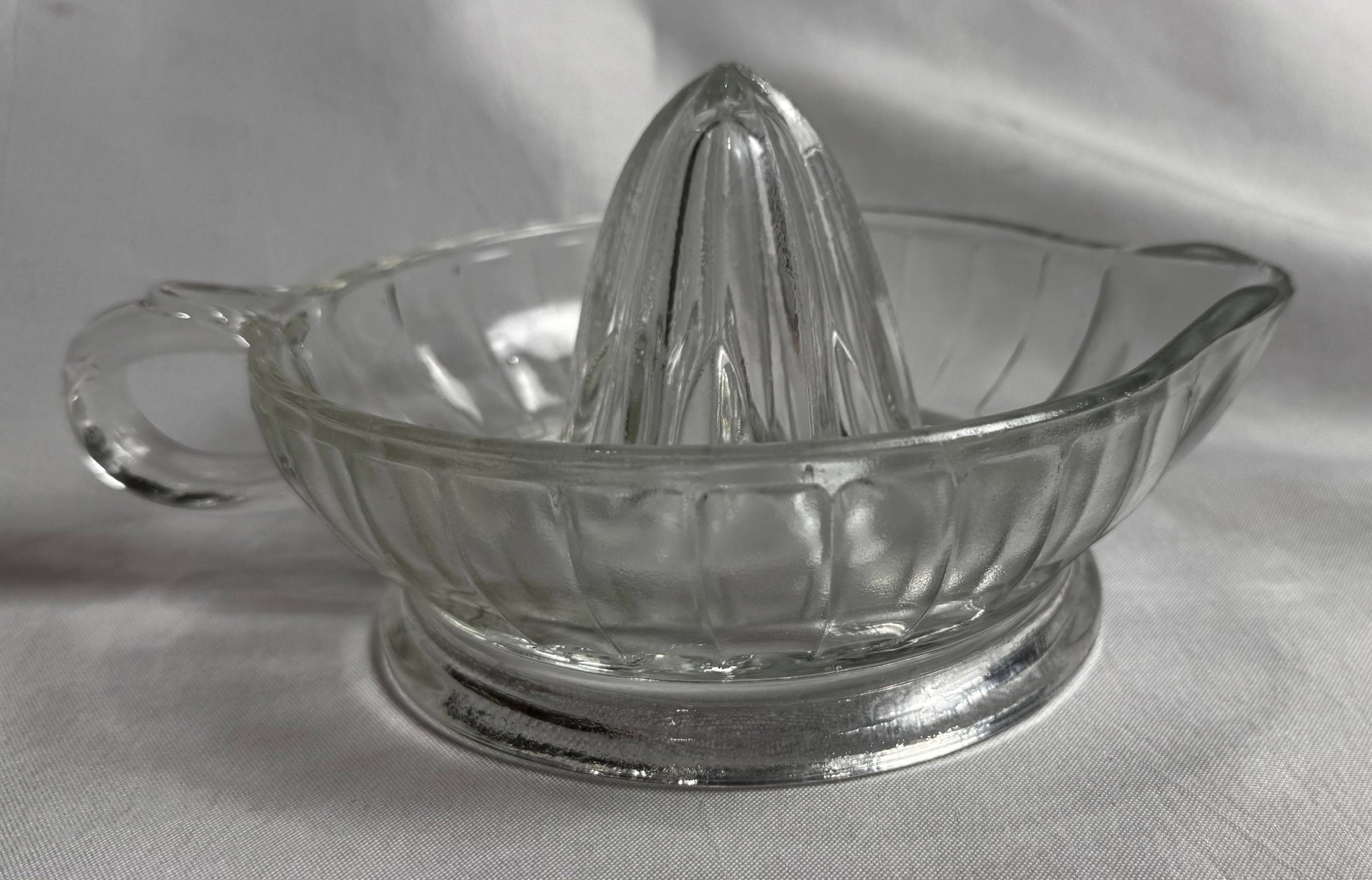 A vintage, clear pressed glass citrus reamer made by Anchor Hocking, dating from the Depression Era to the Mid-Century (c. 1930s-1960s). This manual juicer features a central cone for extracting juice, vertical ribbing around the bowl, a tab handle for easy gripping, and an integrated pour spout.