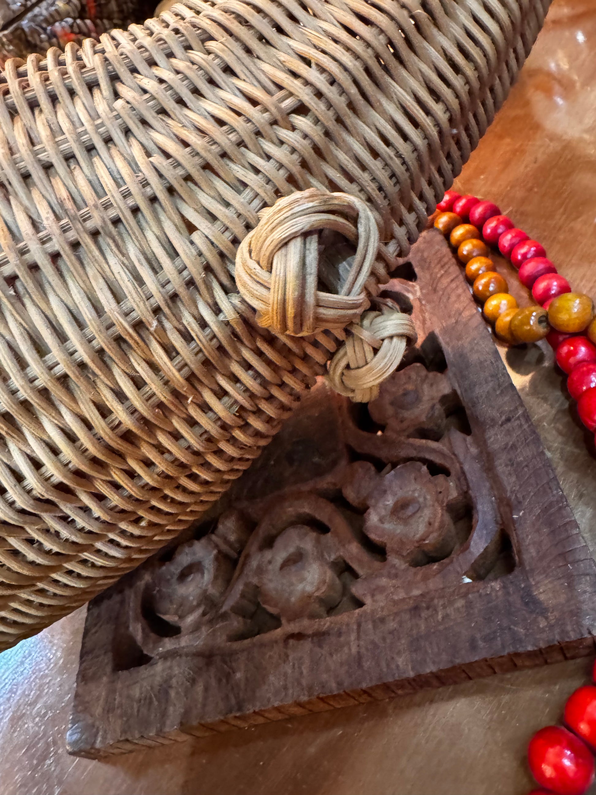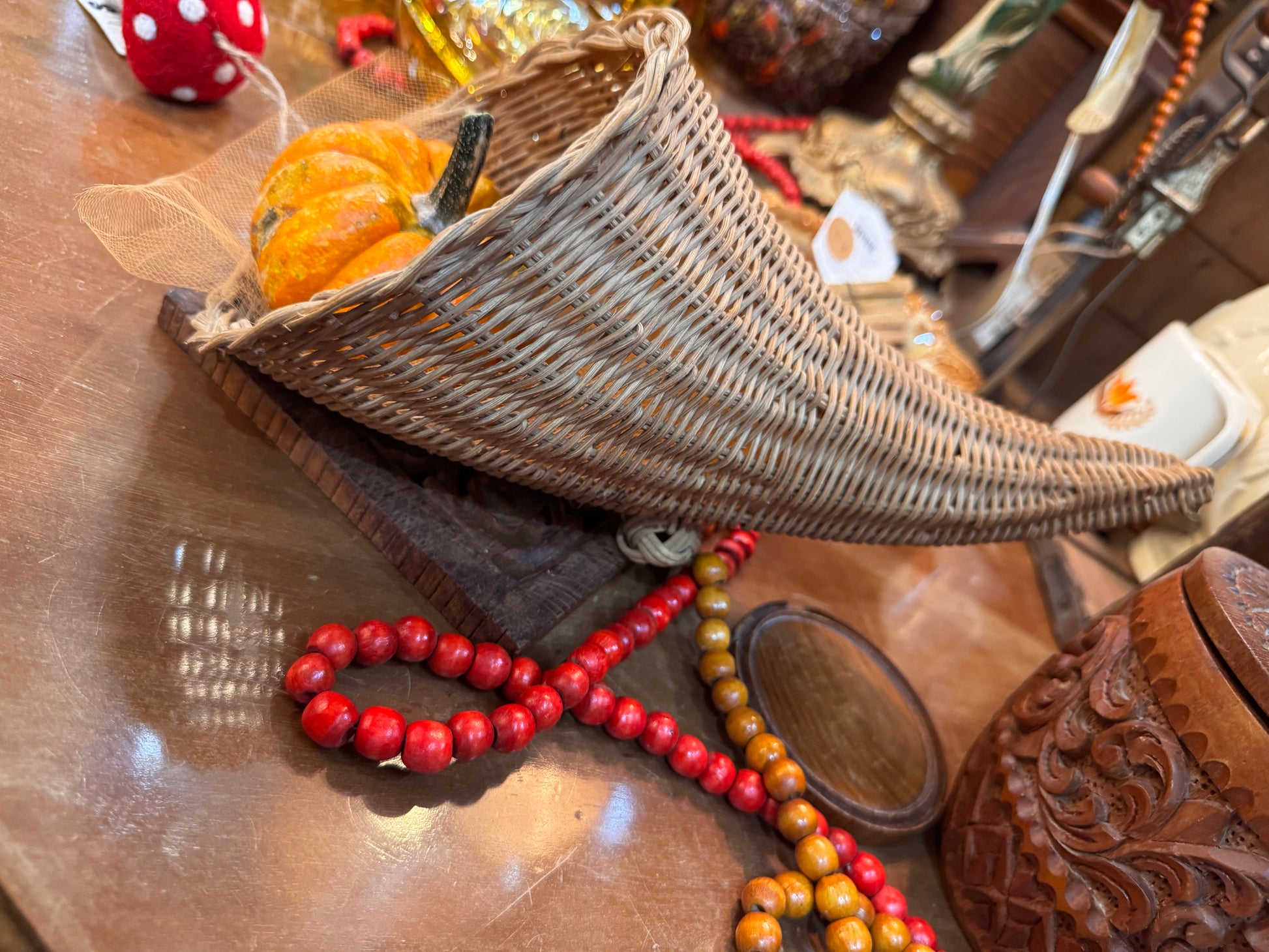 The cornucopia, or Horn of Plenty, is a decorative motif symbolizing abundance and nourishment. The term is derived from the Latin cornu (horn) and copia (plenty). Its origin is traced to Greek and Roman mythology, where it was often associated with deities of the harvest and prosperity. Modern versions, like this one, are typically a wicker, horn-shaped basket used as a Thanksgiving and Fall centerpiece and are displayed overflowing with fruits, vegetables, and grains.