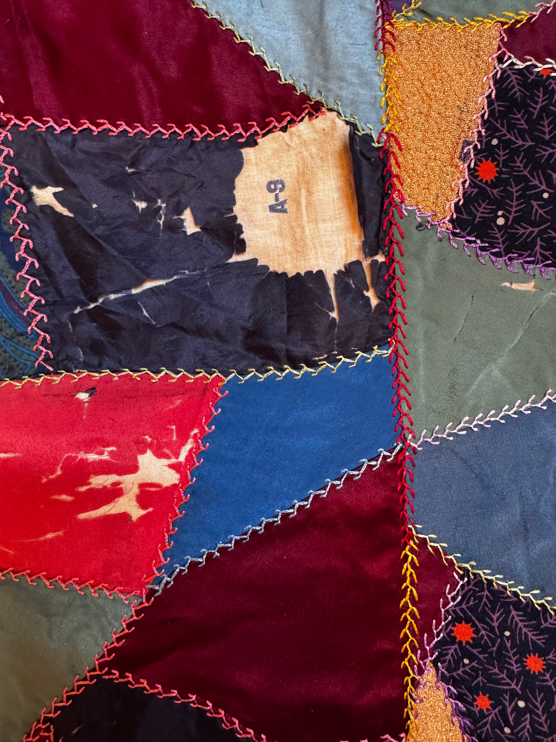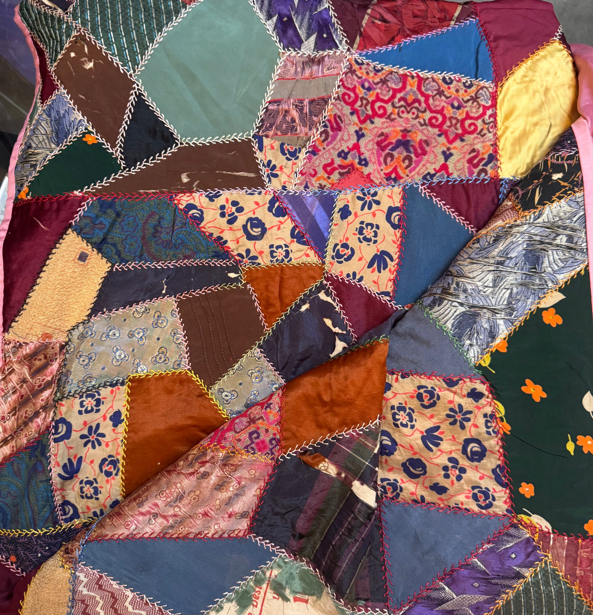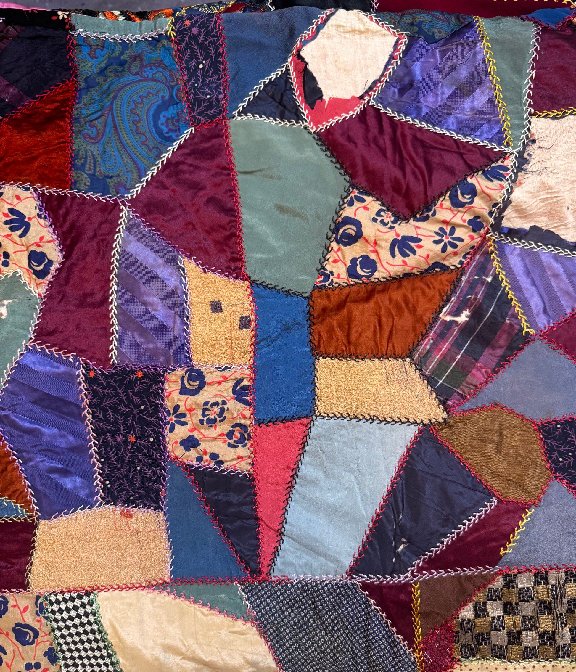 Fabrics such as velvet, silk, and brocade were commonly used, and the seams were adorned with embroidery stitches. Crazy quilts were not typically used for warmth but rather as decorative throws or wall hangings. The style reflects the Victorian love of eclecticism and ornamentation, making each quilt a unique piece of art.