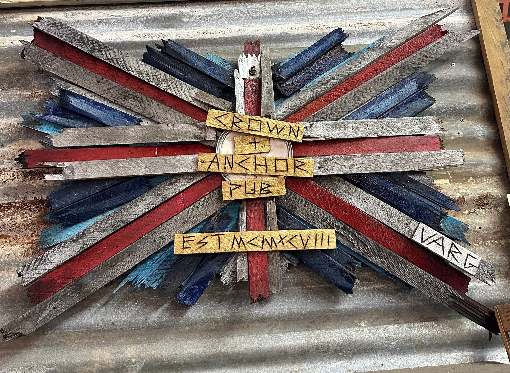 Abstract depiction of the British flag celebrating English pub on the corner of Pelican and Bouny streets since 1998.