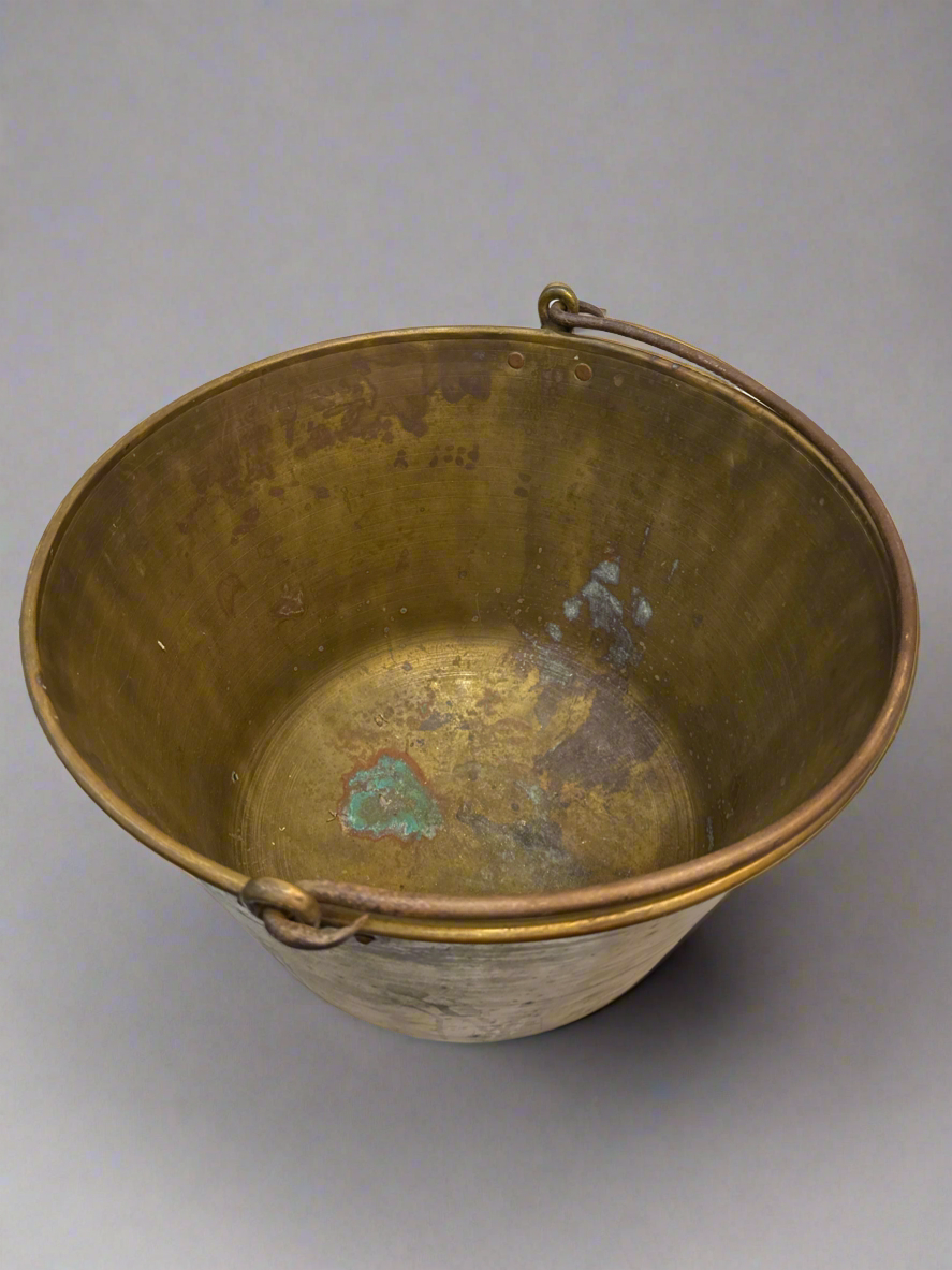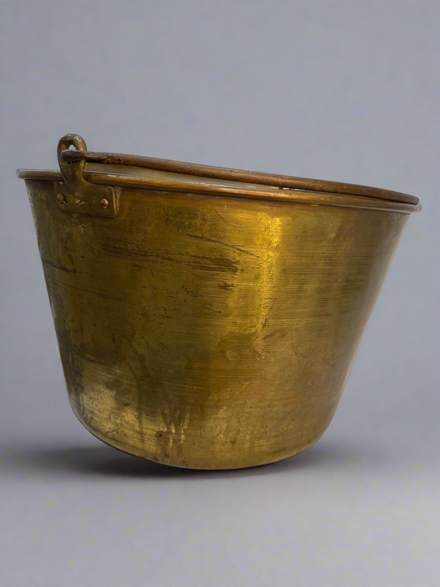 A bold and functional relic from the early 20th century, this oversized solid brass pail was built for heavy-duty use. With hand-riveted swing handles and beautifully aged patina, it may have once held hot coals, lye, water, or even rendered lard. Today, it makes a stunning planter, firewood holder, or industrial farmhouse centerpiece.