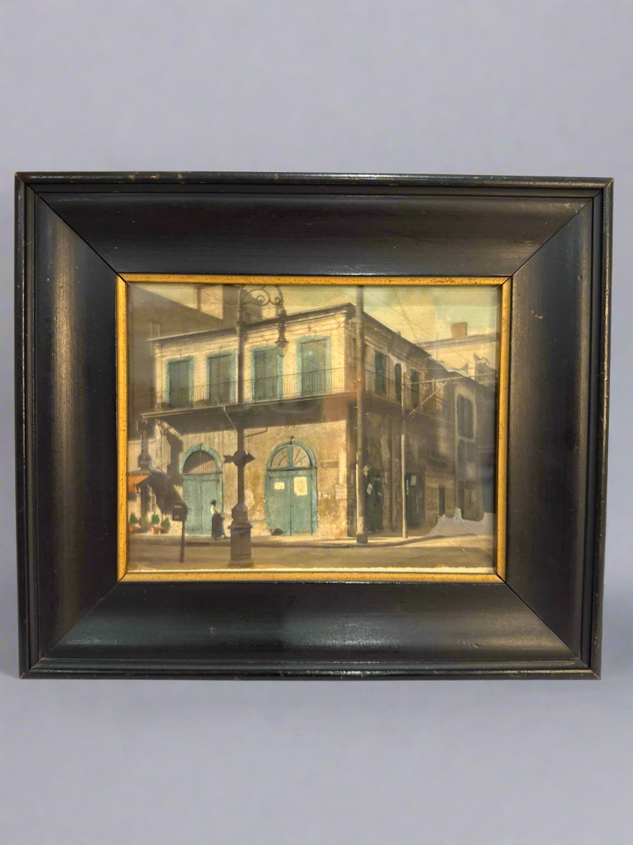 Capture the timeless spirit of New Orleans with this original vintage print by local artist Eugene Delacroix. Featuring a moody, atmospheric rendering of a classic French Quarter corner building—complete with iron balconies, arched shutters, and a glowing gas lamp—this piece reflects the unique charm of Old New Orleans architecture.