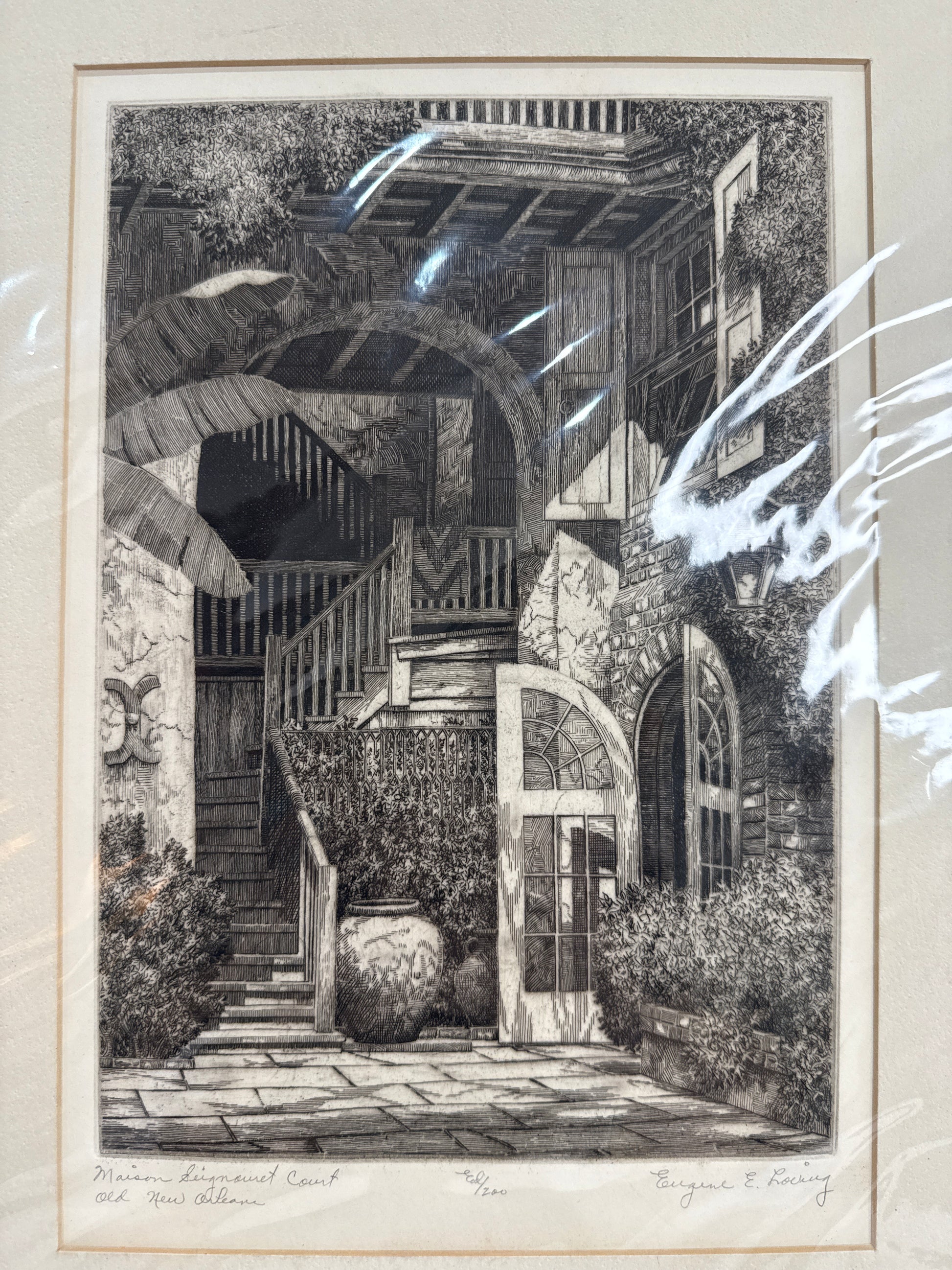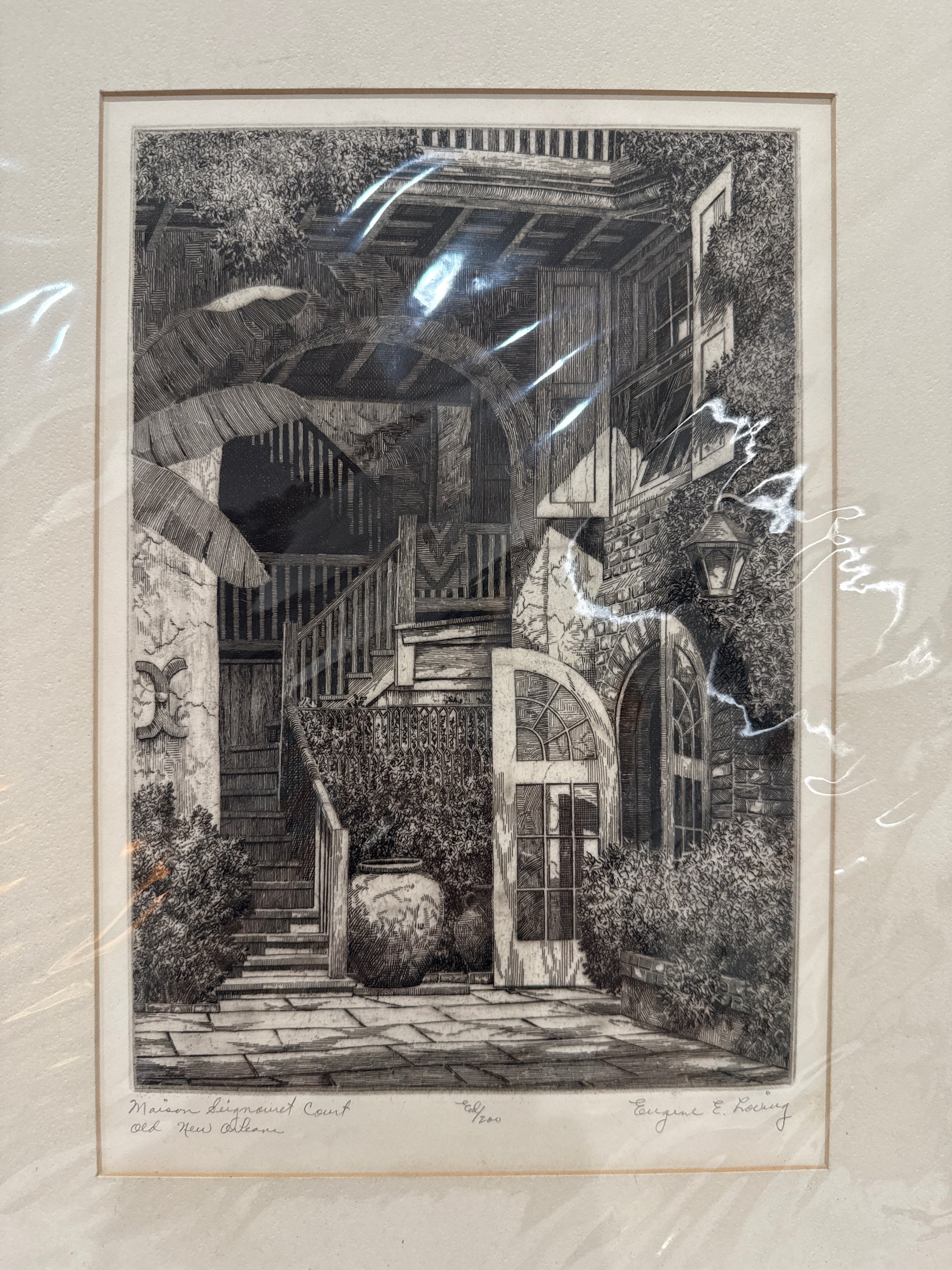 the charming streets of old New Orleans with this captivating etching by acclaimed artist Eugene E. Loving. "Maison Beignouret Court, Old New Orleans" transports you to a lush, historic courtyard, where intricate details and lifelike shading create a sense of timeless elegance.