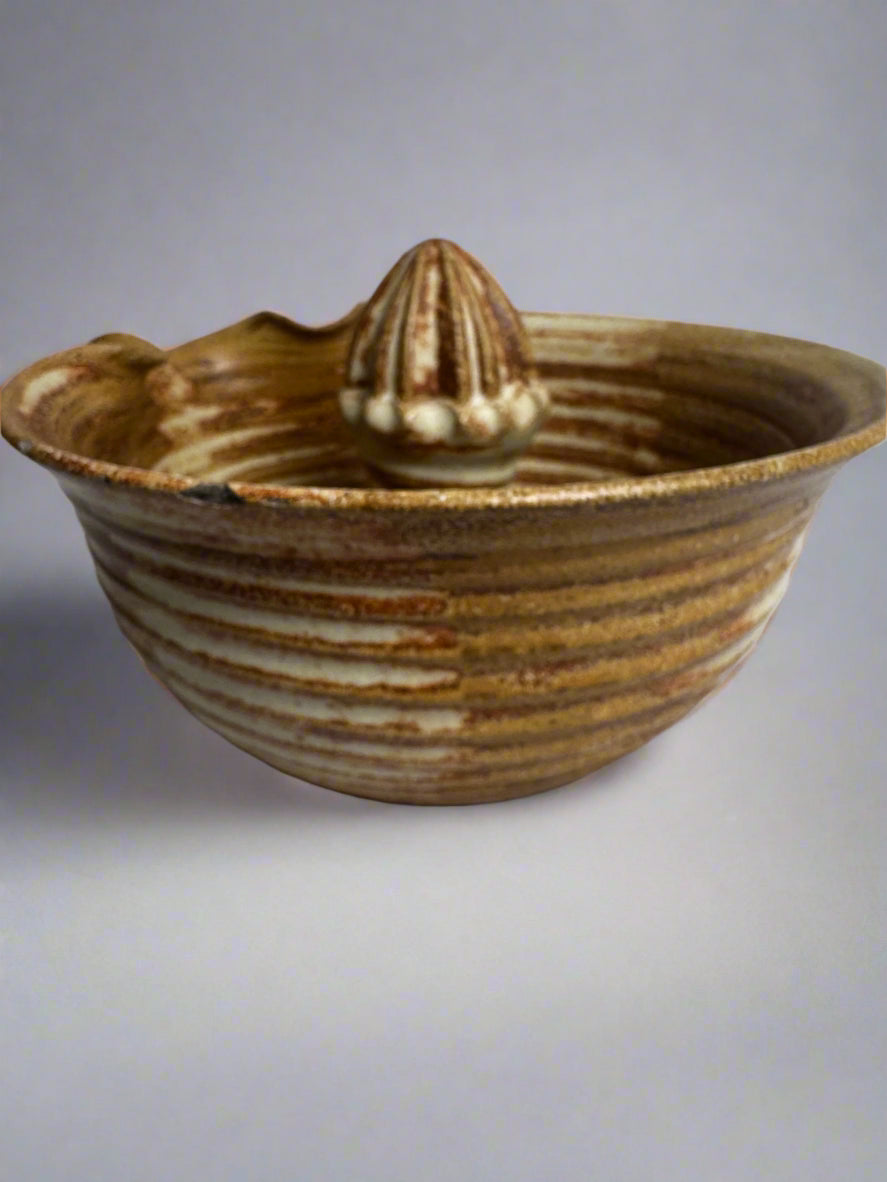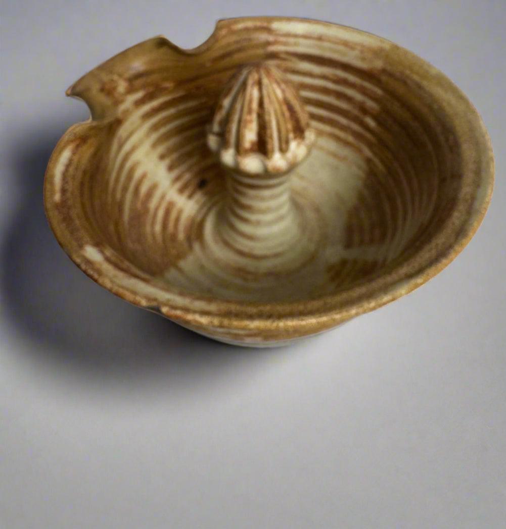 This is a hand-thrown studio pottery juicer by renowned Louisiana artist Tim Cundiff. The piece is made of durable stoneware clay and finished with a swirling, light brown glaze. The interior features concentric, incised circles leading to a ridged reamer for juicing citrus. The exterior is a simple, elegant bowl form with a flared, wavy rim. Due to the natural, textured nature of the clay and glaze, there is a small, shallow chip on the rim that is difficult to see. The base is unglazed and signed "Cundiff" in black. As a piece by a celebrated local potter, it represents a fine example of New Orleans and Louisiana art.