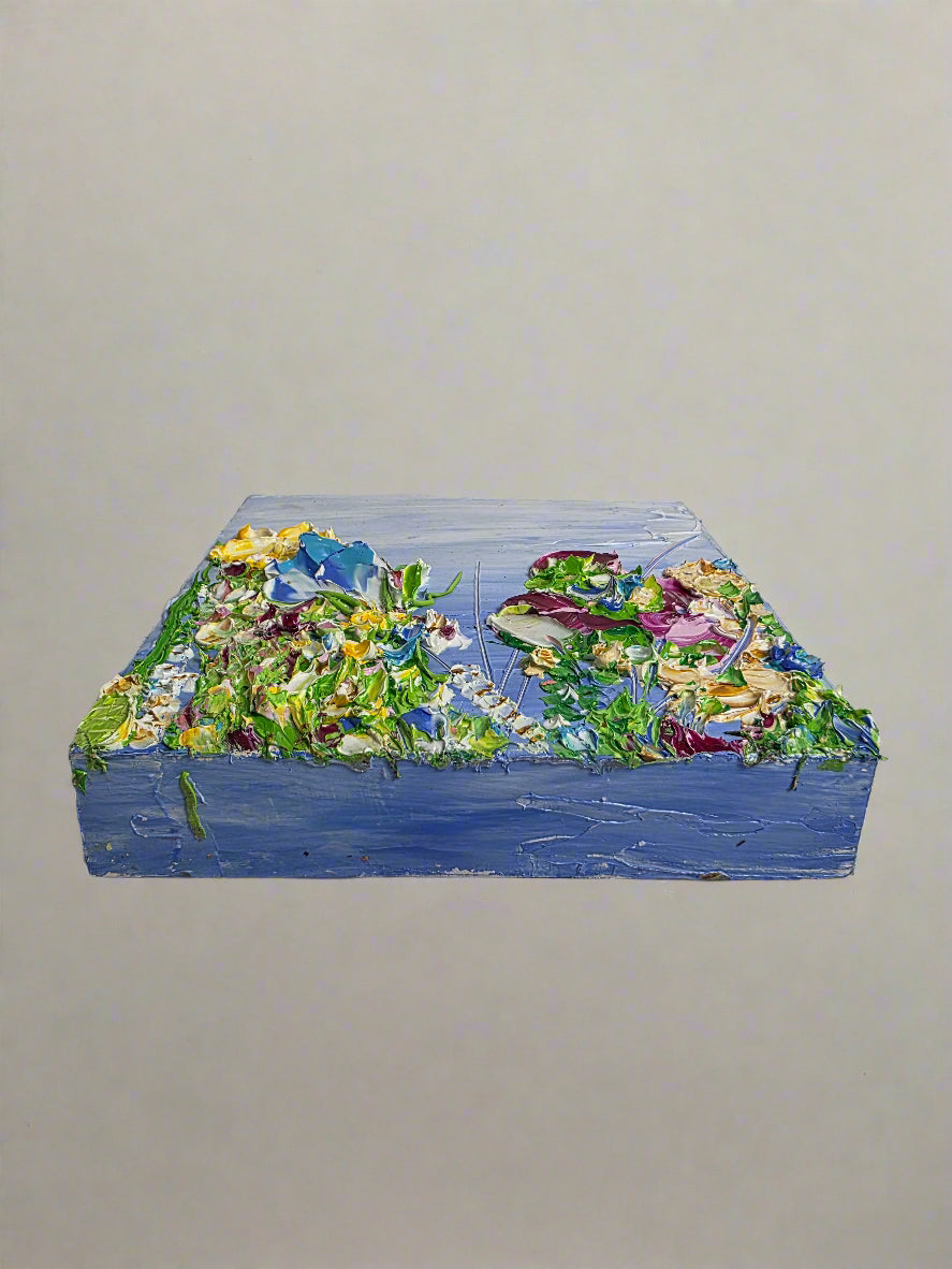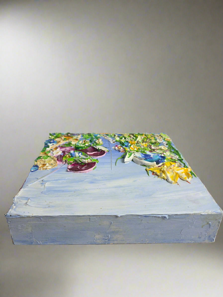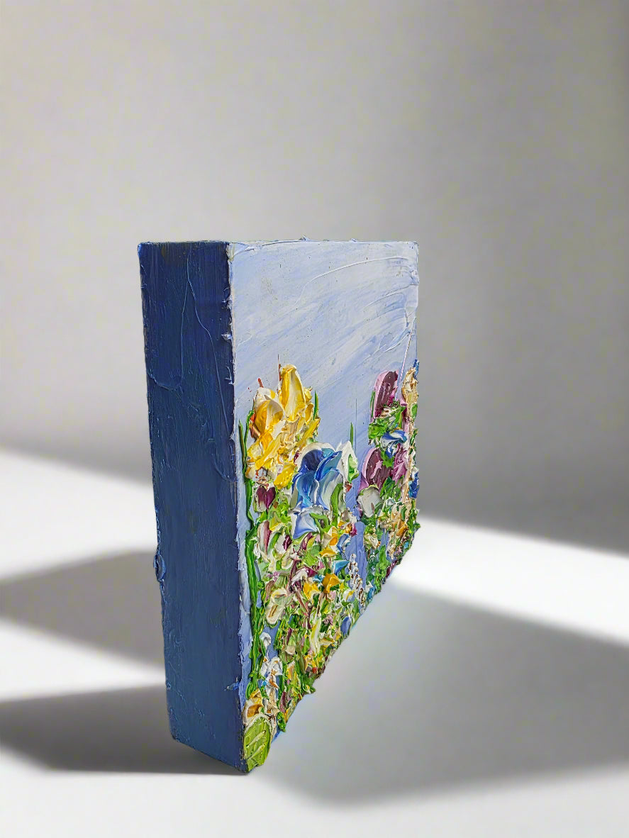 This painting by local artist Ariel K. Karma of AKD art depicts a vibrant and textured field of wildflowers, executed in the impasto style, characterized by thick brushstrokes. Product dimensions are 8"x8"x2"