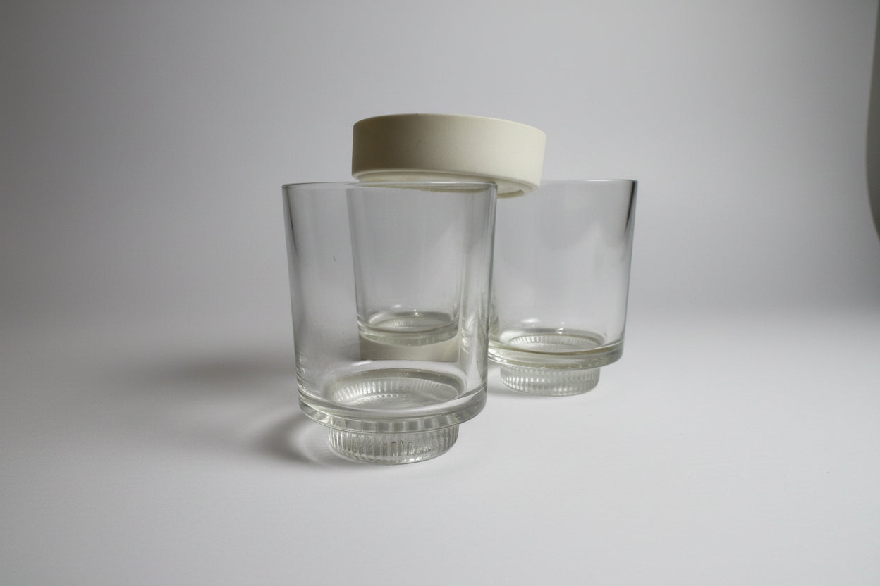 • Composition: Two-piece composite construction consisting of a clear glass tumbler insert and a removable plastic base.