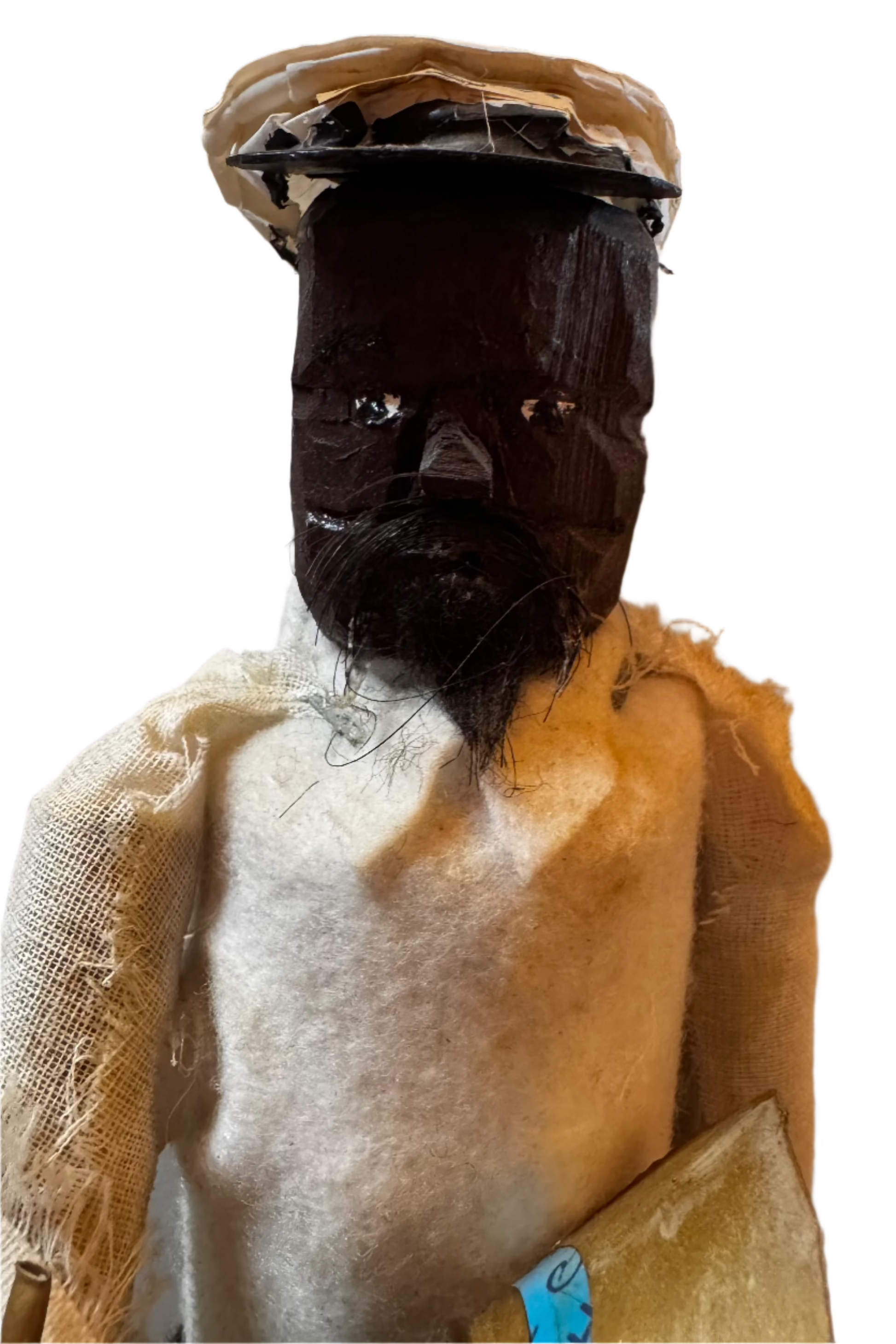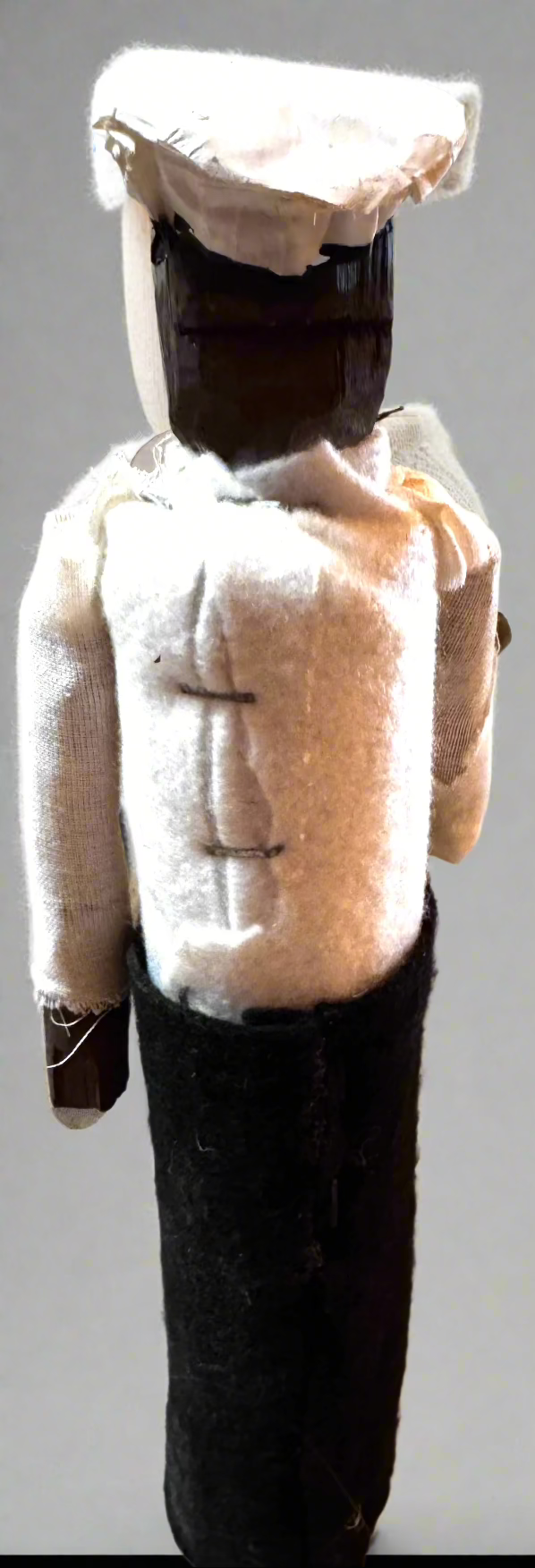 This particular figure, with its carved wooden form and fabric clothing, embodies the spirit of folk art. The subject matter, a musician with a trumpet, suggests a celebration of music and cultural expression within the community. The use of simple materials and techniques further emphasizes the folk art aesthetic.