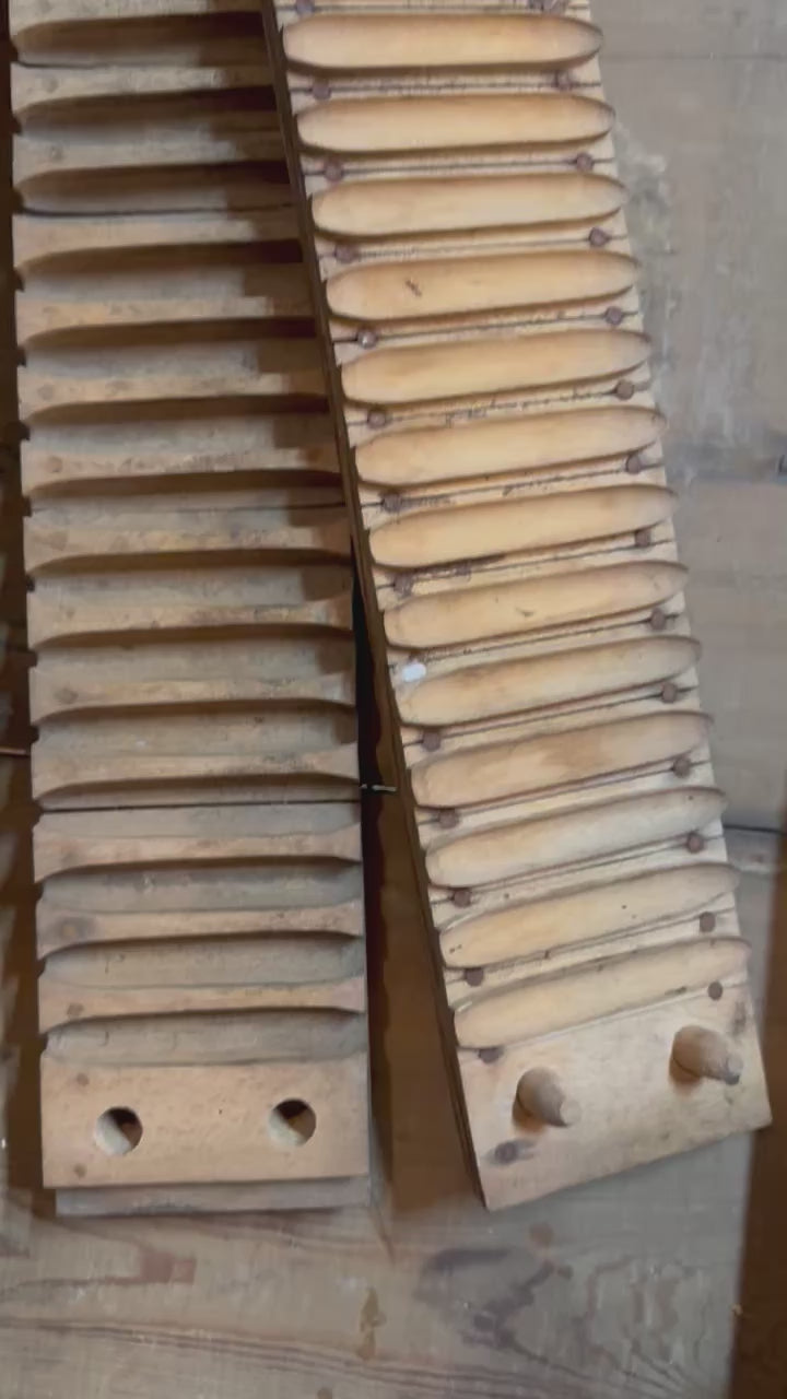This is an authentic antique or vintage two-piece wooden cigar mold (also known as a cigar press or Wickelform). The piece is of definite German origin, clearly marked with the stamped inscription: "EIGENTUM DER FIRMA WILH. OSTERWALD ENGER" ("Property of the Company Wilh. Osterwald Enger"). The manufacturer, Wilh. Osterwald, was a company located in Enger, Germany, historically known for its involvement in the cigar industry. This mold was an essential tool used to press and shape the tobacco bunches into a uniform cylinder before the final wrapper leaf was applied. It features a specific number stamp—№94 151230—and is connected by wooden pegs, with corresponding holes on the side for ventilation/locking, showcasing the meticulous craftsmanship typical of German tobacciana tools from the late 19th or early 20th century.