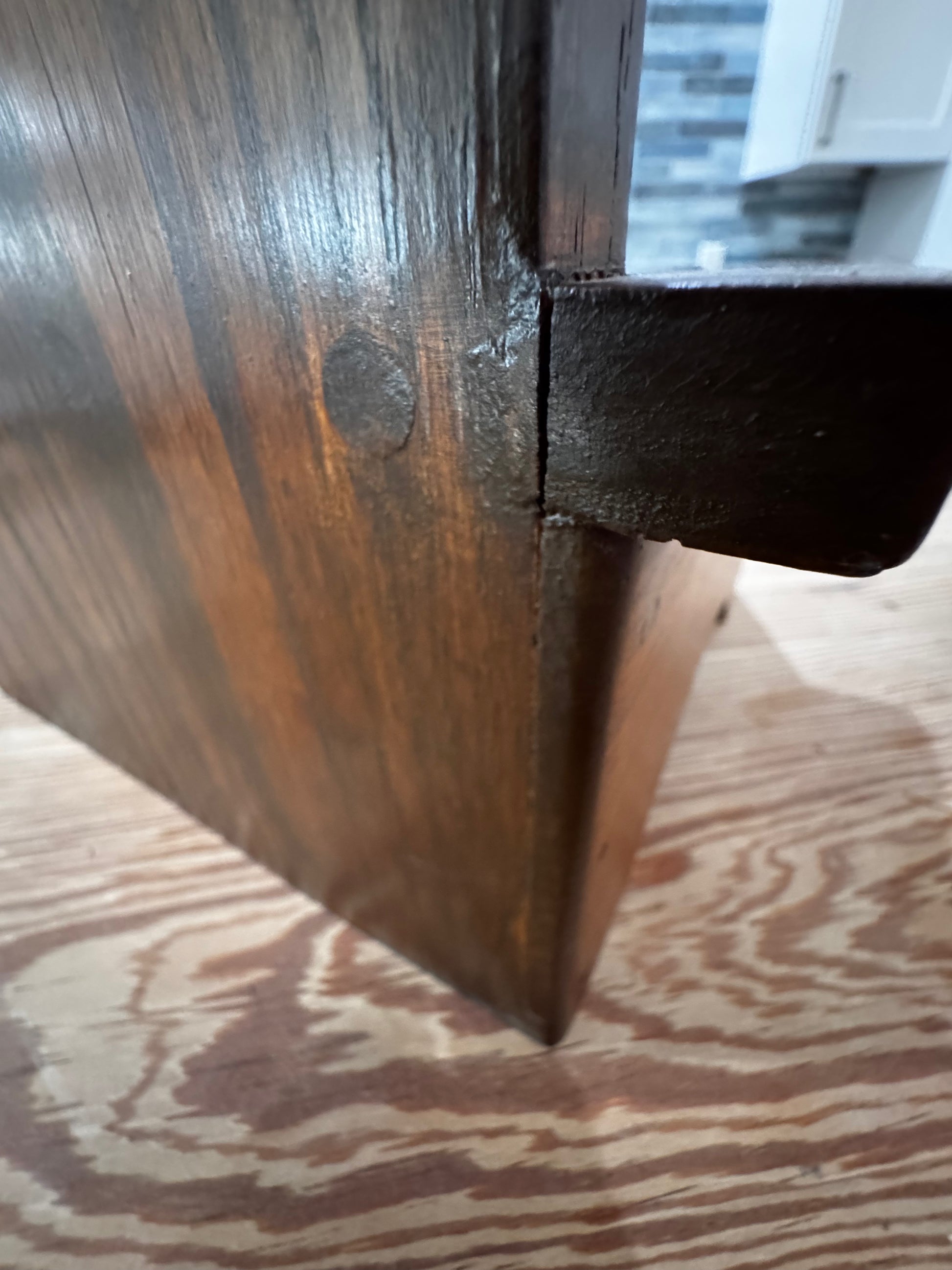 Material and Construction: The construction is solid wood, Oak, given its distinct, coarse grain and condensed pore pattern. Oak was widely used for durable church and institutional furniture. The current dark finish is typical of the somber aesthetic favored during the Gothic Revival period. The kneeling platforms and vertical supports are constructed entirely of solid wood.