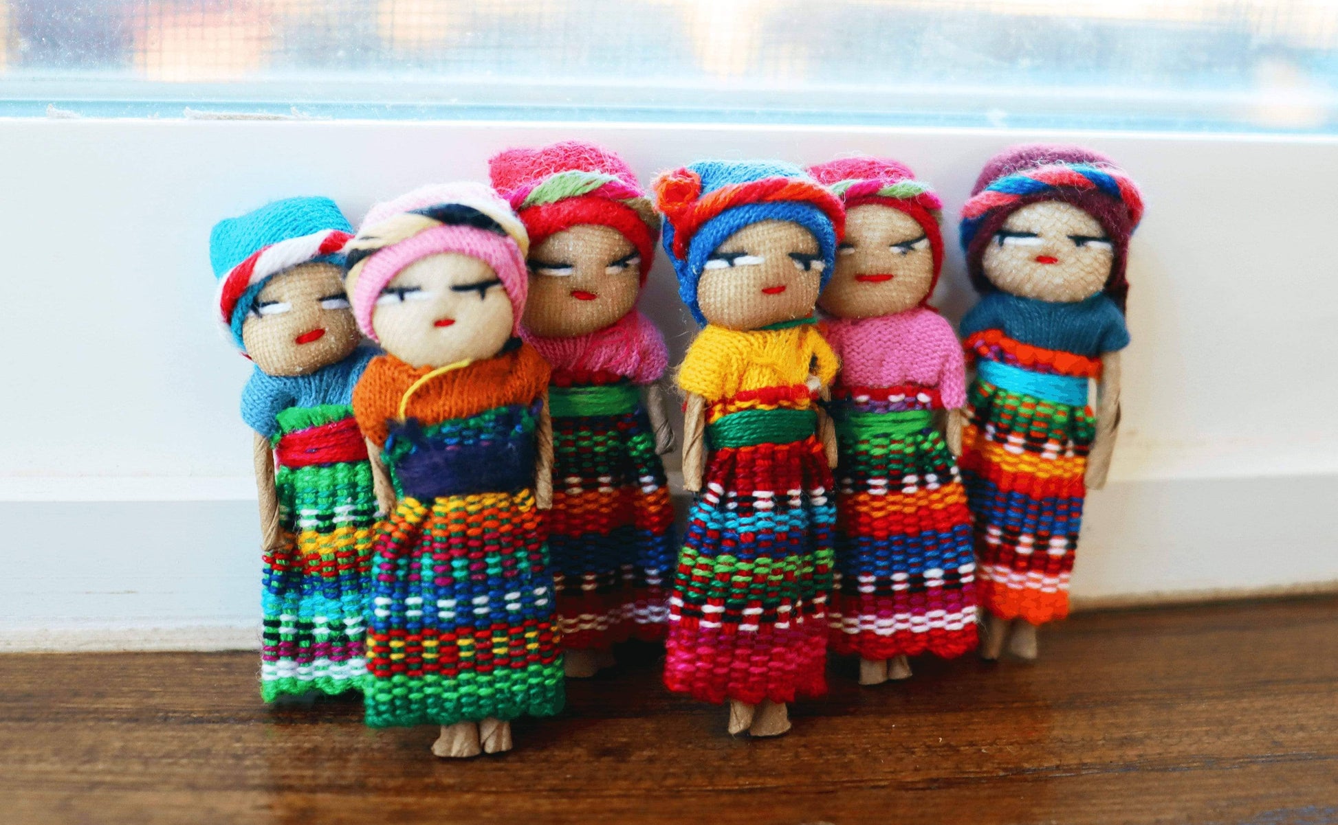 Guatemalan Worry Dolls in a set of 6. According to Guatemalan legend, when children go to bed at night, they tell one worry to each doll and then place them under their pillows. In the morning, the dolls have taken all their worries away. This set of 6 dolls, each dressed in traditional Guatemalan clothing will help anyone, of any age, have their worries taken away. Each doll is handmade fair trade.