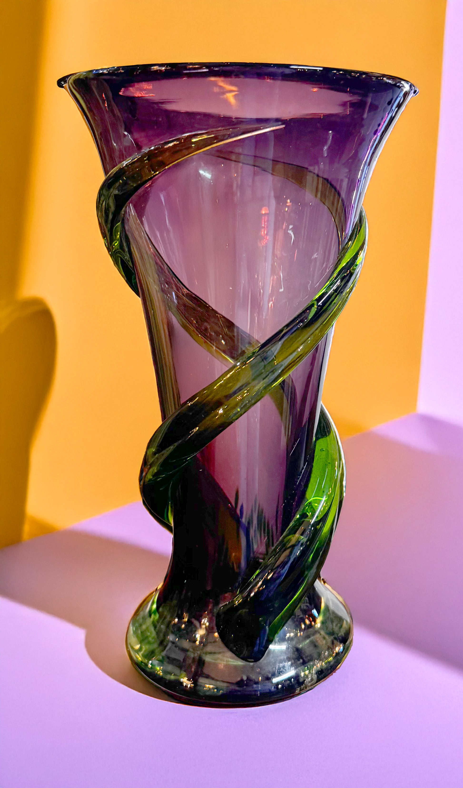 Hand Blown Purple and Green Vase. 9.5" tall.