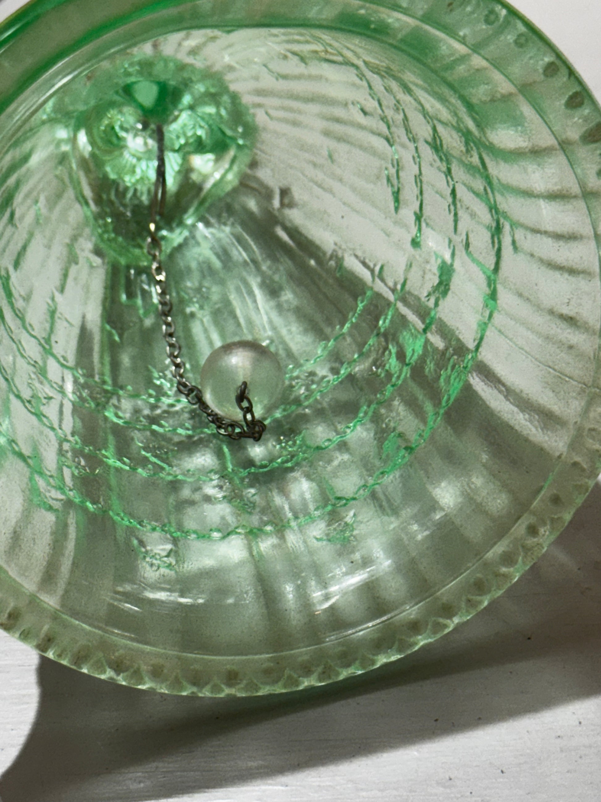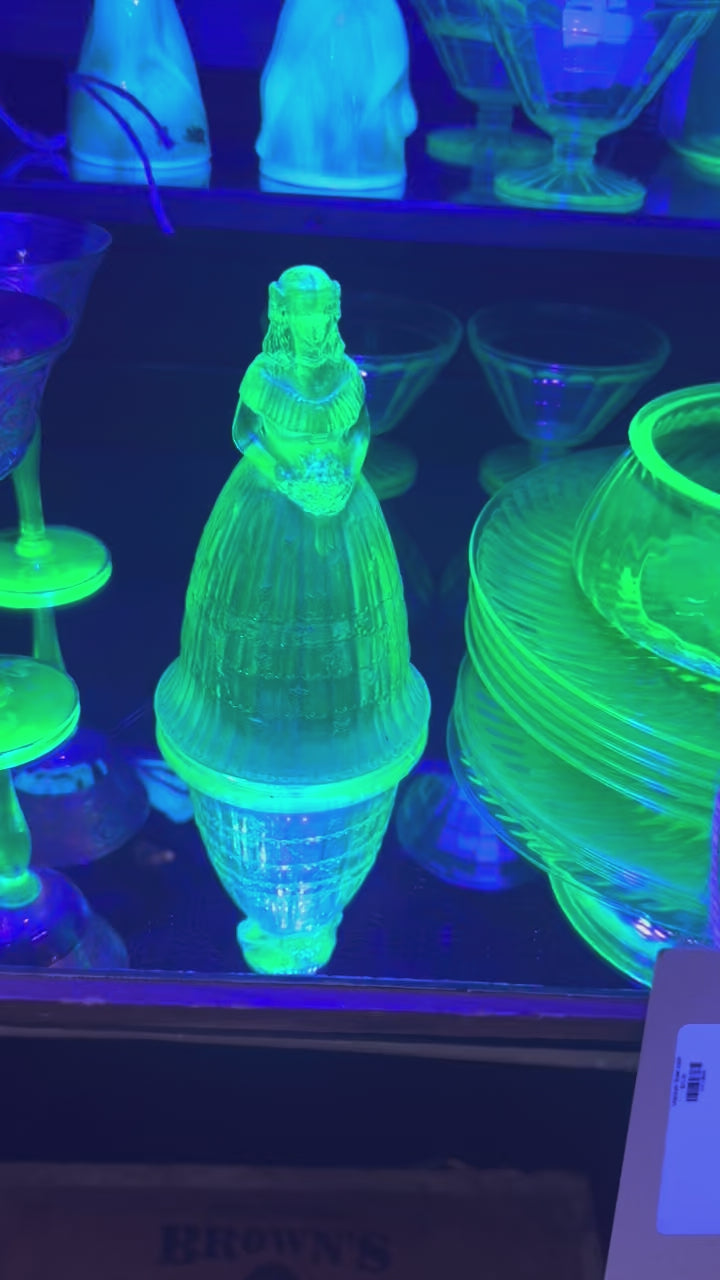 What truly sets this particular "Southern Belle" Bell apart is its mesmerizing uranium glass composition. Under natural light, it exhibits a beautiful, subtle hue, but when illuminated by a UV (black) light, it springs to life with an otherworldly, radiant glow – a captivating display that's sure to be a conversation starter.