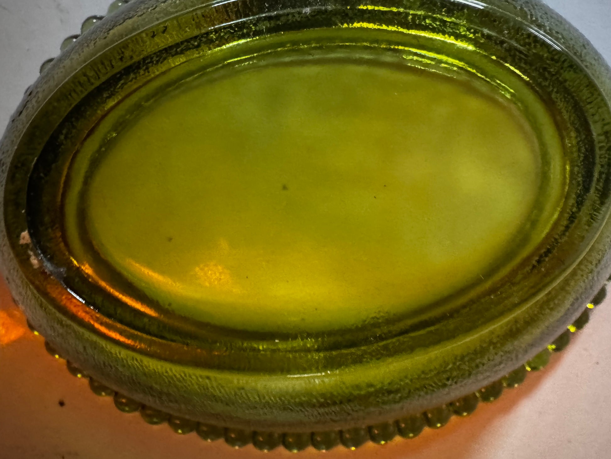 This authentic vintage covered dish was produced by the Indiana Glass Company, likely during the 1960s or 70s. It features the signature "beaded edge" rim that distinguishes Indiana Glass hens from other makers like Imperial or Fenton.