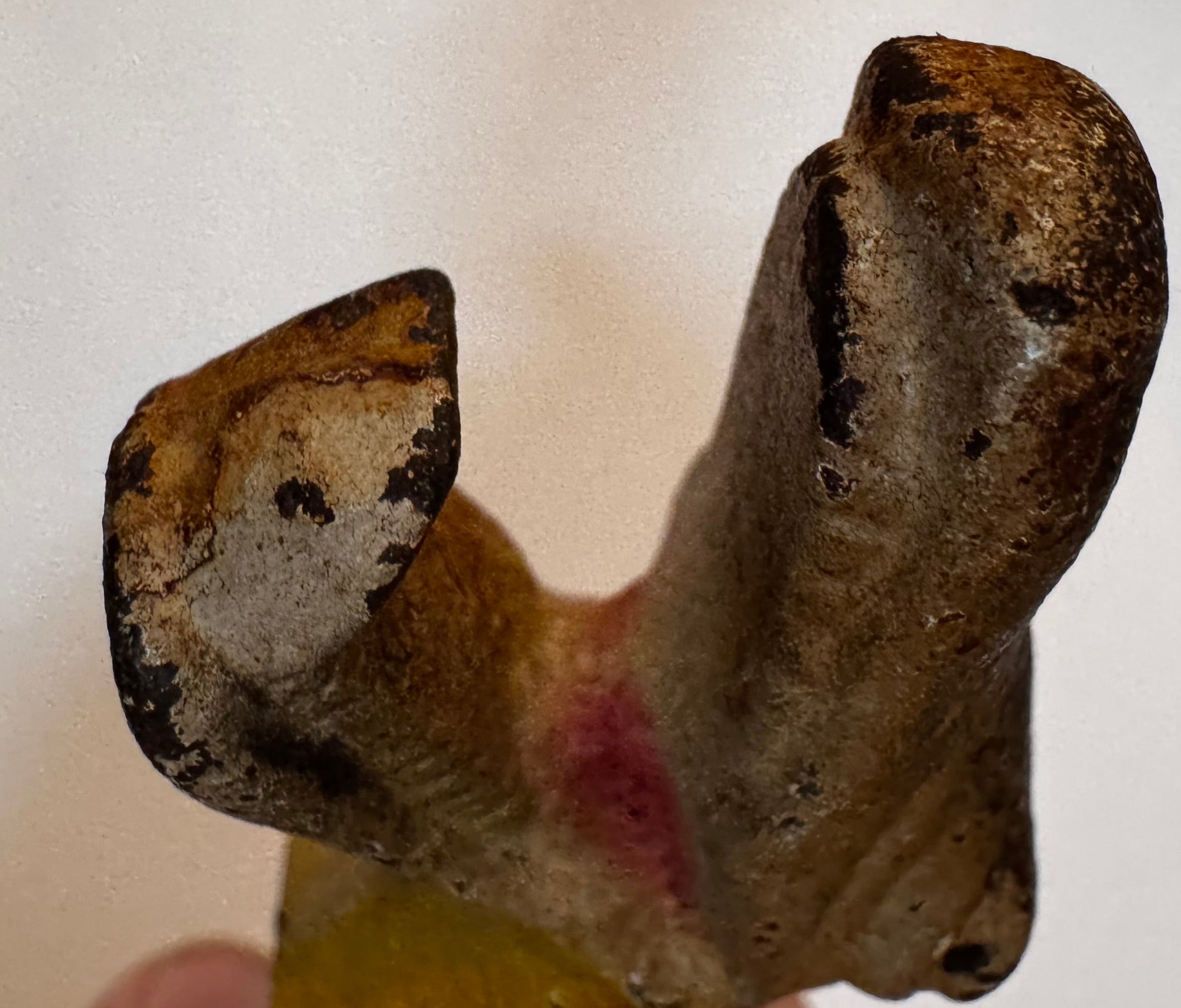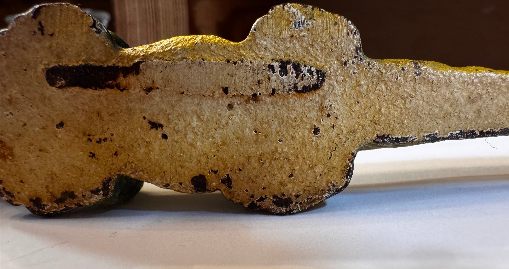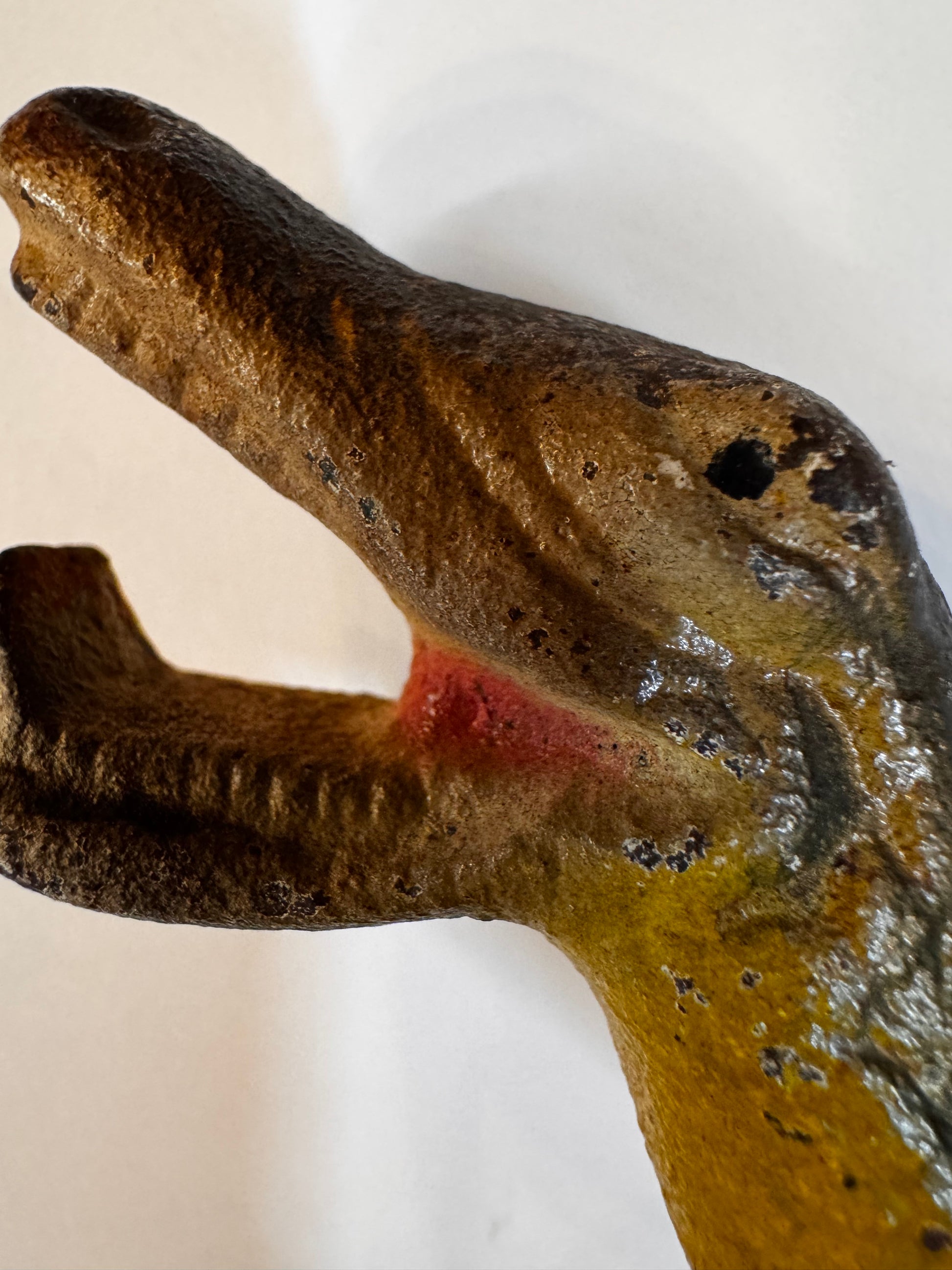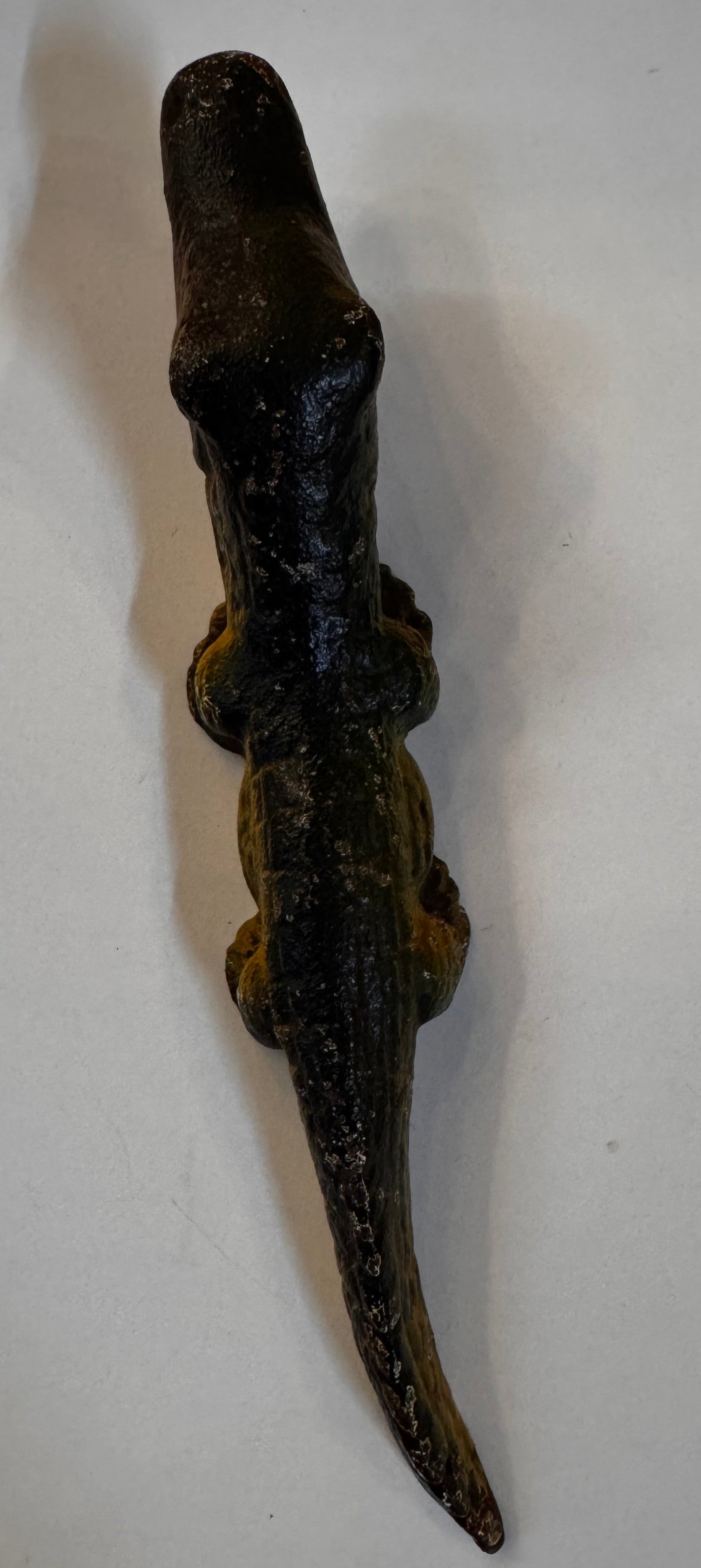 This is a rare, vintage Mid-Century Cast Iron Alligator Bottle Opener produced by the John Wright Company (c. 1940s–1960s). It is in superb collectible condition, fully retaining its original hand-painted accents of gold, black, and the unique red mouth detail (Images 3, 5). Functional and dense, this piece is an authentic example of American figural novelty cast iron. The