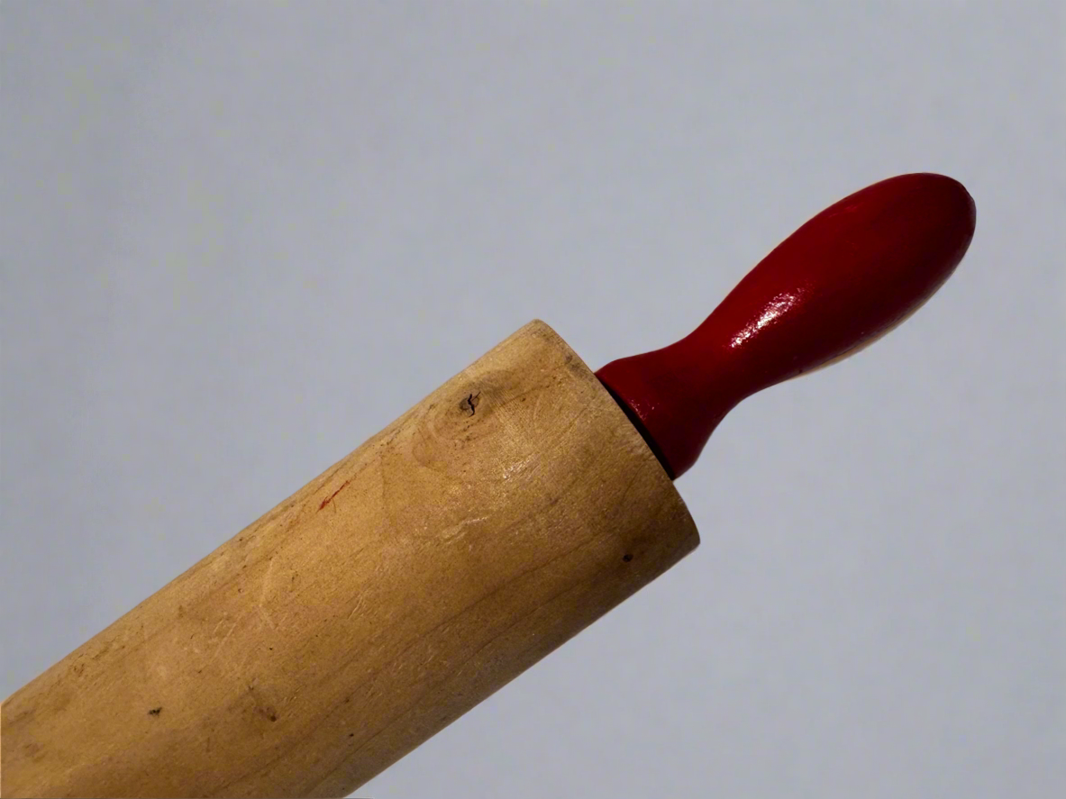 Wooden rolling pins, like this one, were particularly popular in the early to mid-20th century. The red painted handles add a touch of vintage charm, reminiscent of the colorful kitchenware of the 1950s and 60s. These pins were not only functional but also served as toys, allowing children to mimic their parents in the kitchen.