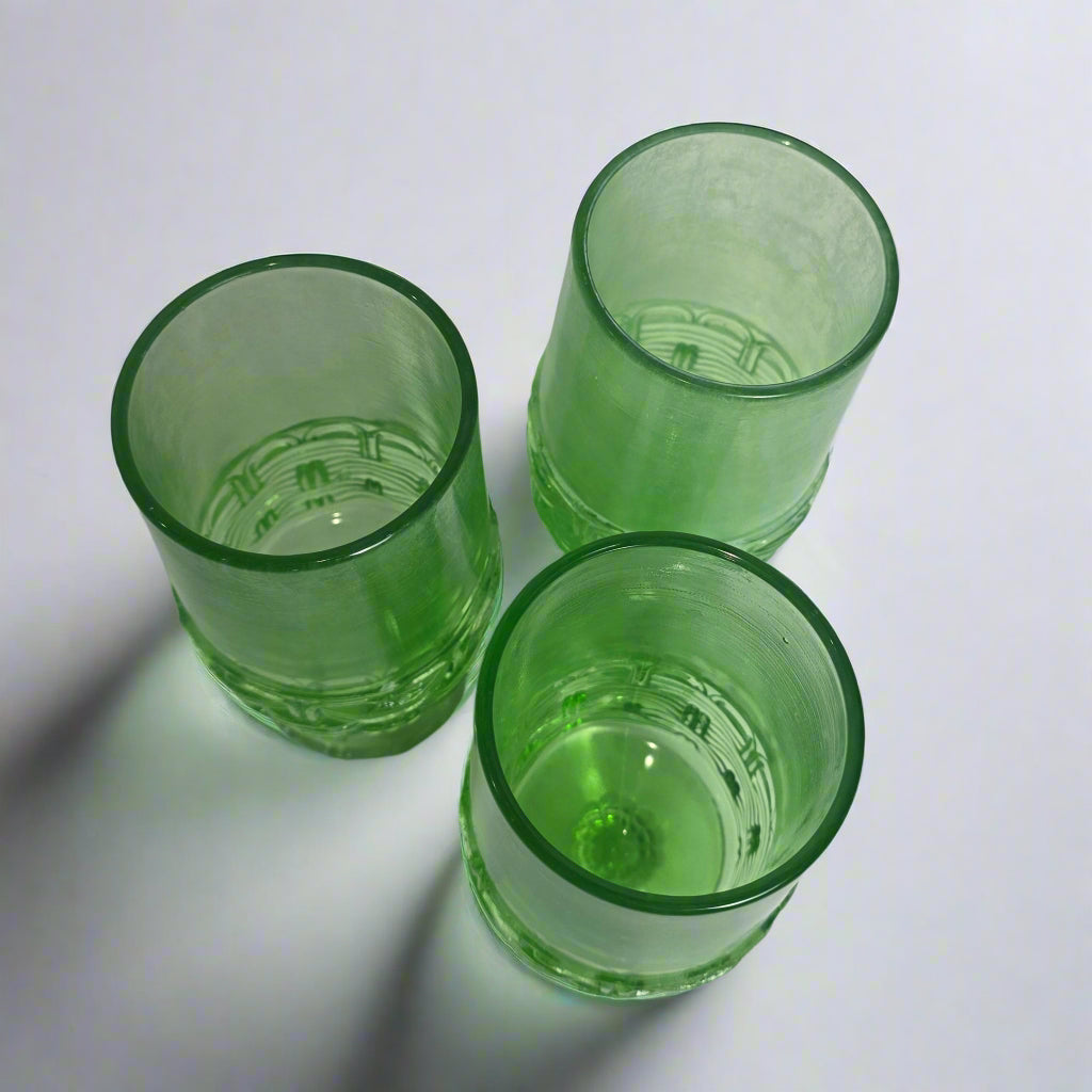 This set of three large goblets is part of the same "Mount Vernon" or "Lorain Basket" pattern manufactured by the Indiana Glass Company. These larger pieces are known for their sturdy, elegant design with the prominent basketweave pattern and square foot. They are suitable for use as water goblets or iced tea glasses . Due to their size, single large pieces of this type can be a desirable find for collectors .