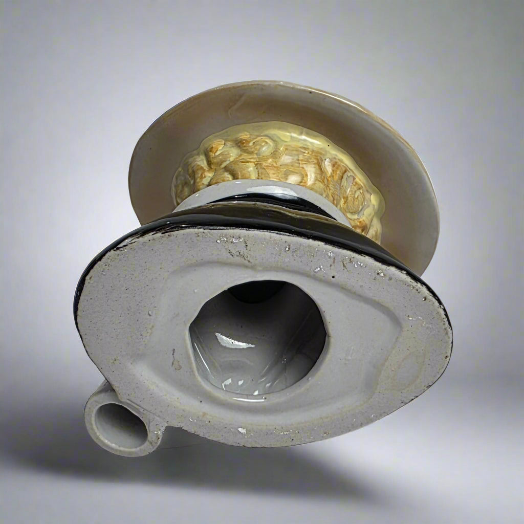 Bring timeless charm and elegance to your collection with this vintage porcelain figurine of a blonde lady wearing a wide-brimmed hat. Beautifully hand-painted, this piece features delicate detailing including soft facial features, bright red lips, and a refined pose with her hand gracefully raised to her face. Her wide golden-yellow hat with a white ribbon, along with her black dress and golden collar, highlight the craftsmanship and artistry of mid-20th century ceramic design.