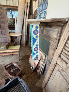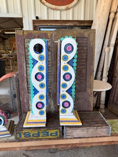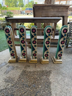 Large multicolored decorative wooden brackets (corbels). Height 32.5 inches; Width 9.5 inches; Depth 7.5 inches.