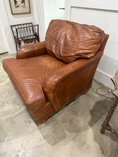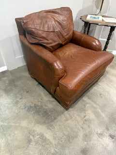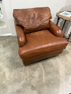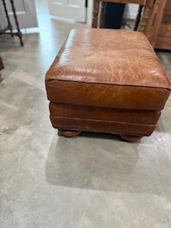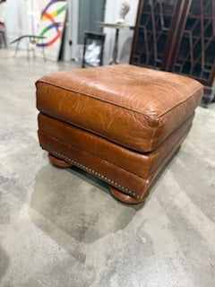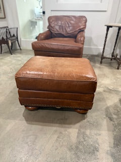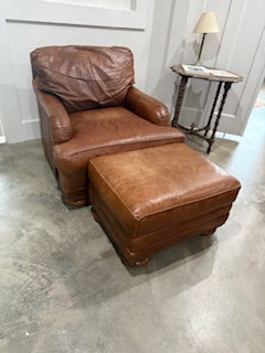 Used brown leather chair and ottoman. Chair - back height 32 1/4 inches; chair seat height 17 inches; chair width 36 inches; chair depth 35 1/2 inches. Ottoman - height 17 inches; width 27 inches; depth 22 1/4 inches.
