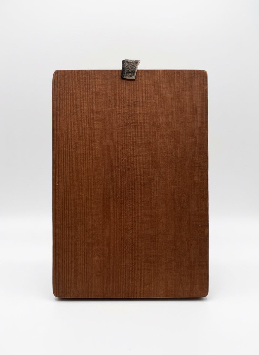 This particular piece, with its carved wood and woven background, is characteristic of decorative arts from the mid-20th century, often produced as affordable home decor. Such items were popular during the post-war era, reflecting a desire for accessible art that brought warmth and spiritual resonance into homes. The style suggests it could be from Europe or North America, where modernist craft movements were prevalent.
