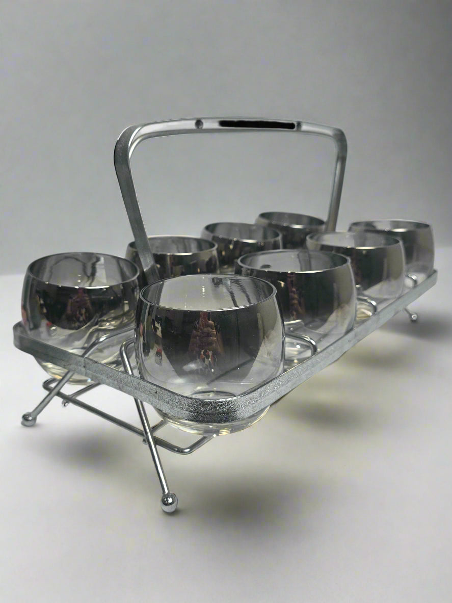 This is a vintage Mid-Century Modern barware set, consisting of eight roly-poly glasses and one chrome-plated caddy. Each glass features a silver-fade metallic finish. The set is complete with its original caddy, which includes a handle for carrying. The caddy is designed to hold all eight glasses. The set dates to the mid-20th century.