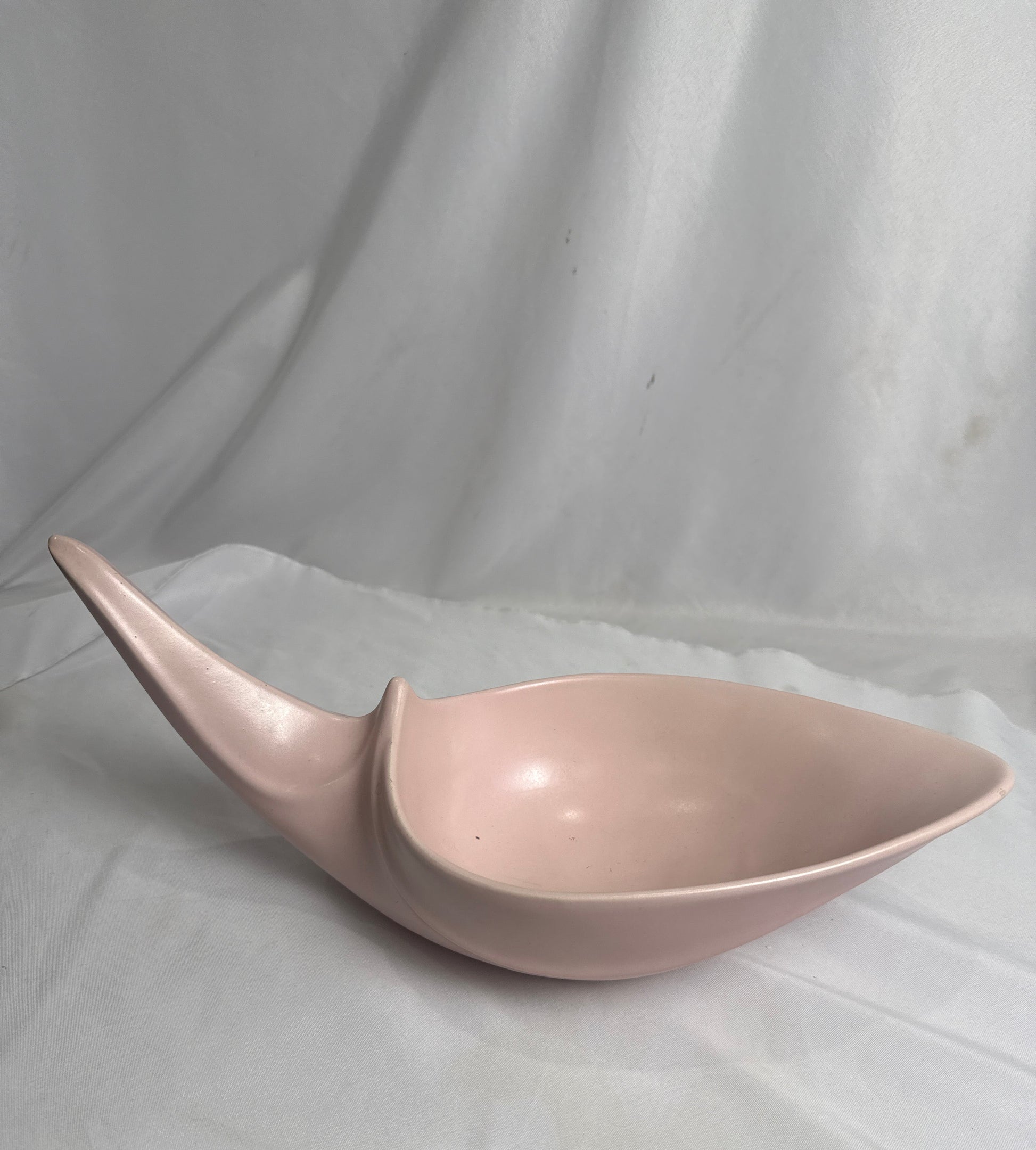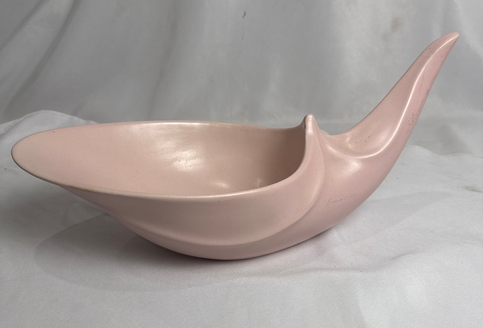A vintage mid-century modern ceramic centerpiece bowl in a soft pastel pink glaze. The bowl features a dramatic sculptural design with elongated swooping ends and a fluid, biomorphic form, typical of 1950s–1960s decorative pottery. Unmarked (based on what I see), but in the style of Haeger or California pottery. Ideal as a display piece, planter, or retro accent in a modernist décor.