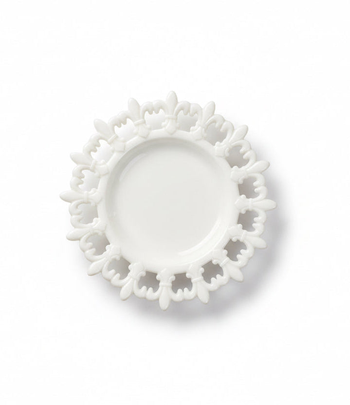 • Design: Deep white milk glass with a delicate Fleur De Lis cutout rim.