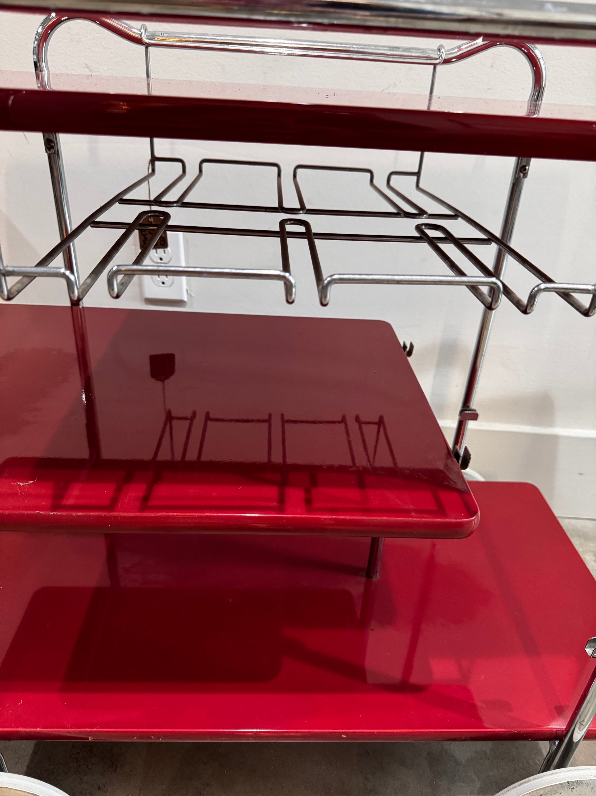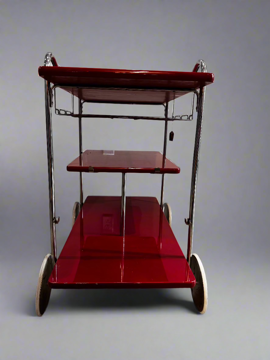 Italian design during this period was particularly known for its flair and innovation, often incorporating bold colors and luxurious materials. The use of chrome and lacquered wood reflects the era's fascination with industrial materials and their potential for creating elegant, functional pieces. Such bar carts were not only practical but also served as a statement of modern living and sophisticated taste.