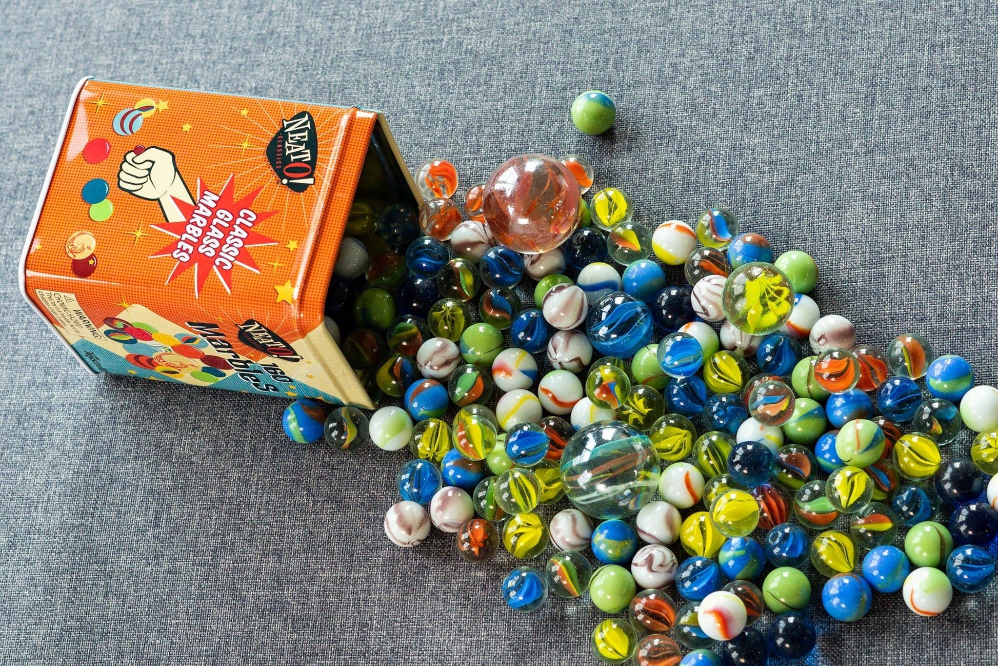 This beautiful glass marble game set from Neato! includes 160 glass marbles of various sizes in an assortment of bright colors and patterns. Some marbles are made of clear glass and maintain a see-through quality mixed with waves or lines of color, while other marbles are opaque and appear to be completely colored. A 4.5 x 7.5-inch retro storage tin with a removable lid provides an easy way to keep marbles from getting lost or damaged. • Age Grade: 5+ • Product Dimensions/Weight: 3.6 L x 3.6 W x 4.8 H / 2.4 lb • Inner Pack Dimensions/Weight: 2.0 L x 8.6 W x 10.8 H / 30.6 lb •