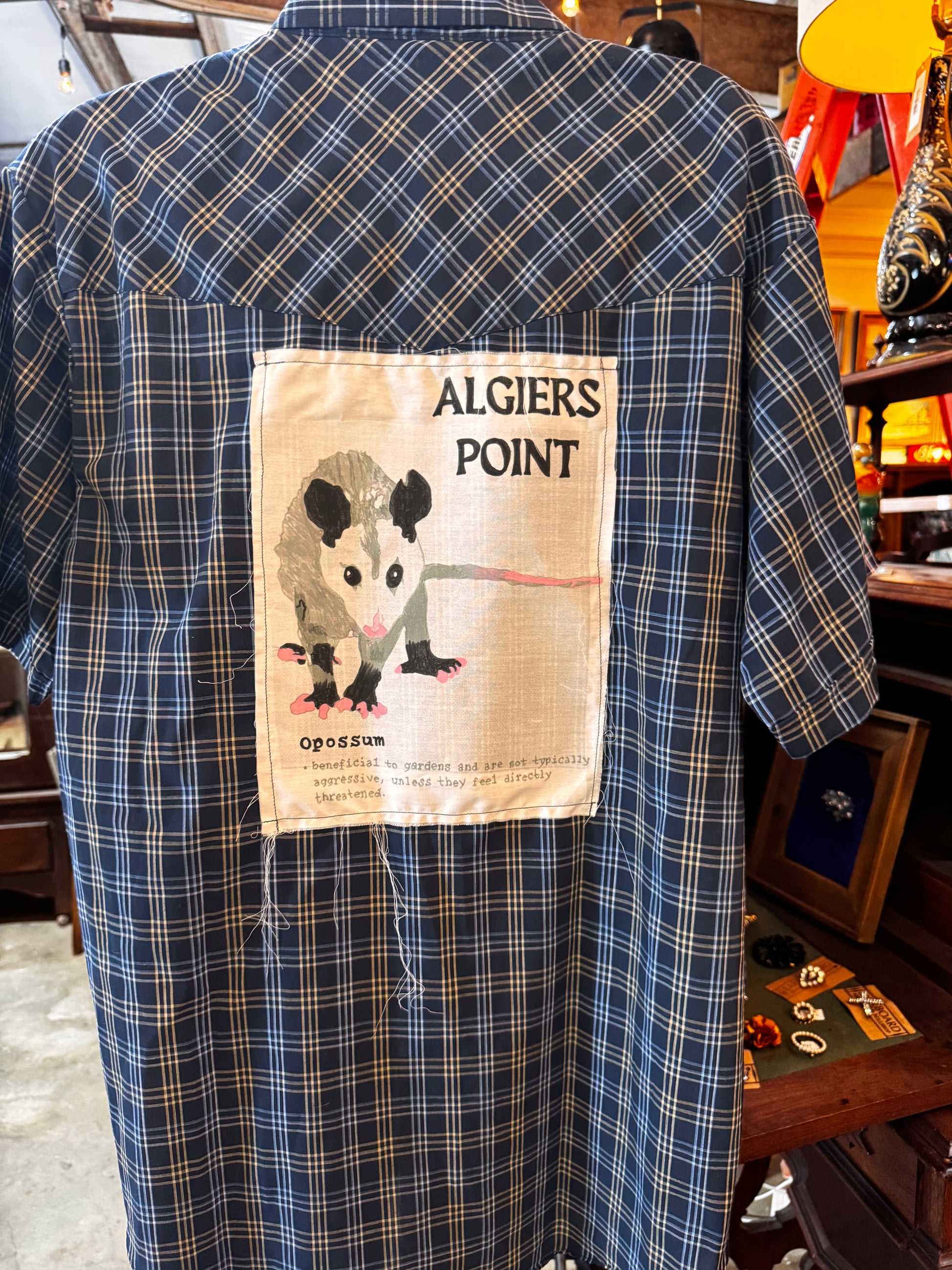 One-of-a-kind style, straight from Algiers Point! Gerlaine's shirts are a unique fusion of mid-century cool, arcane pop culture vibes, and a wink of offbeat humor. Crafted by a talented woman entrepreneur right here in our neighborhood, each piece reimagines discarded items into wearable art. Don't miss out on owning something truly special from the Point!
